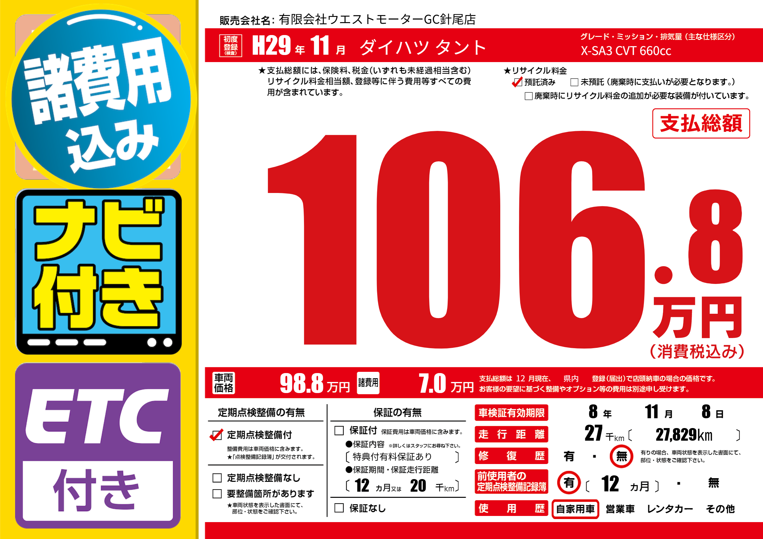 | 車名 | ダイハツ タント | グレード ミッション 排気量 |