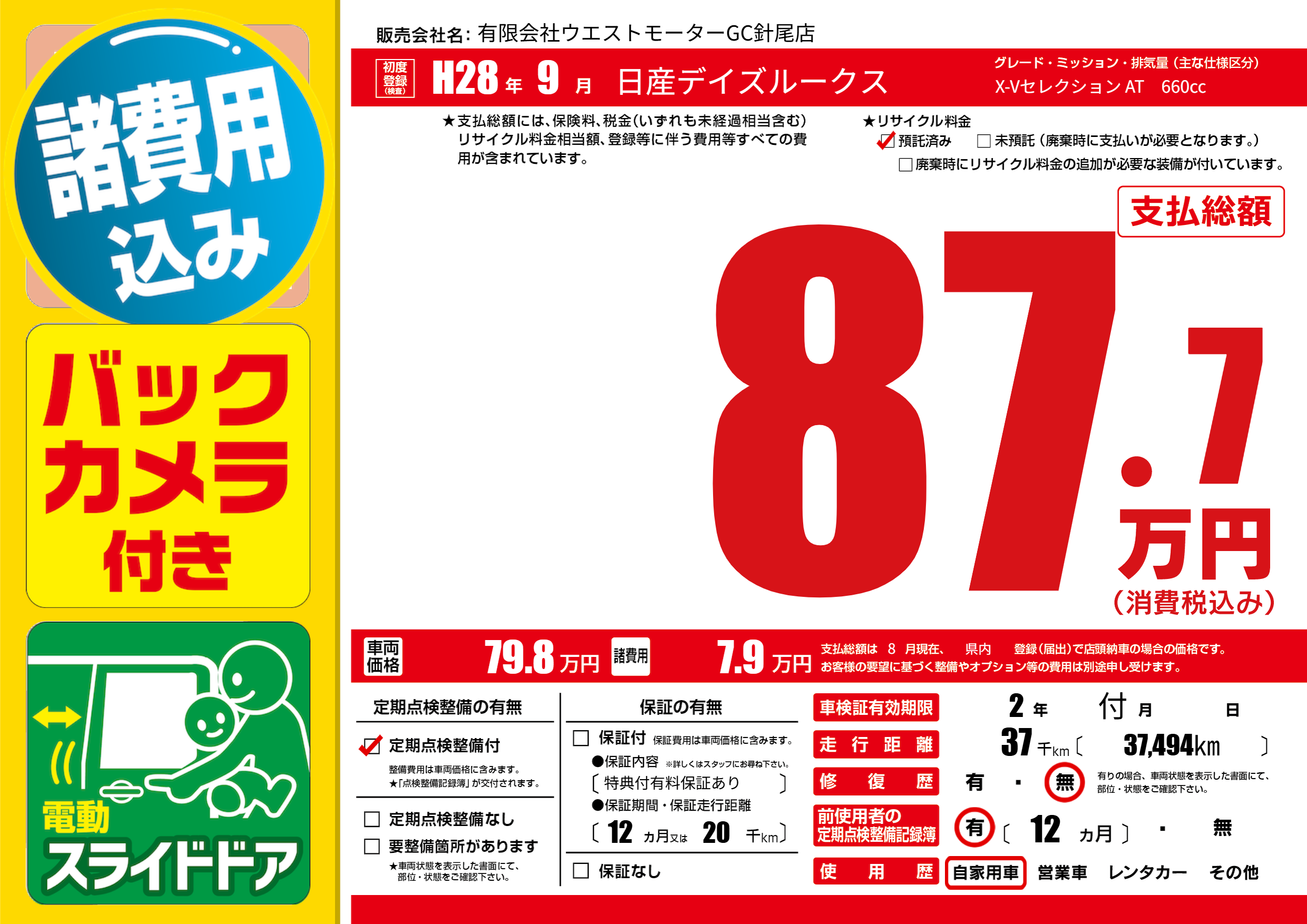 | 車名 | 日産デイズルークス | グレード ミッション 排気量 |