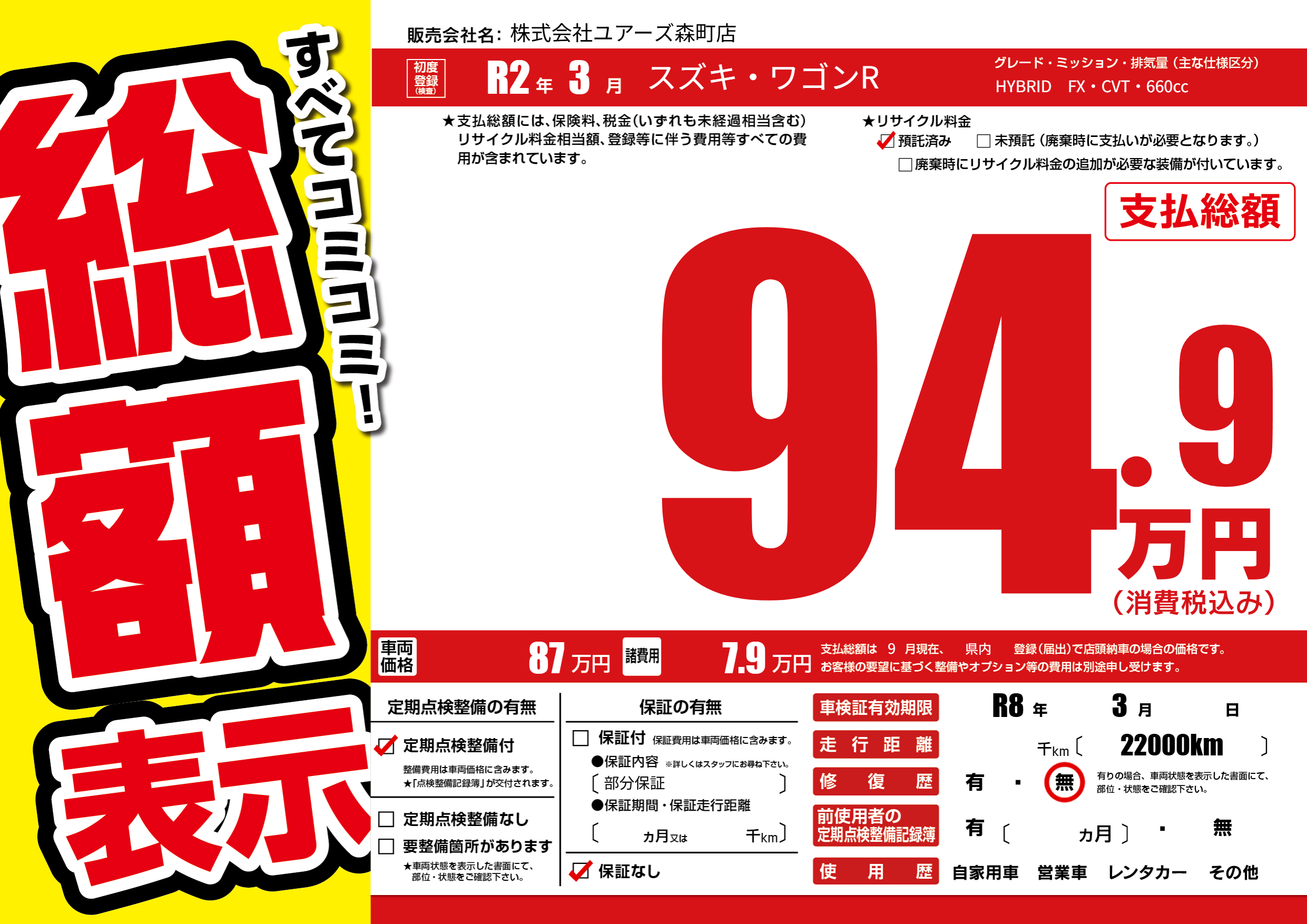 | 車検制限 | R8年 3月 - 日 | ||