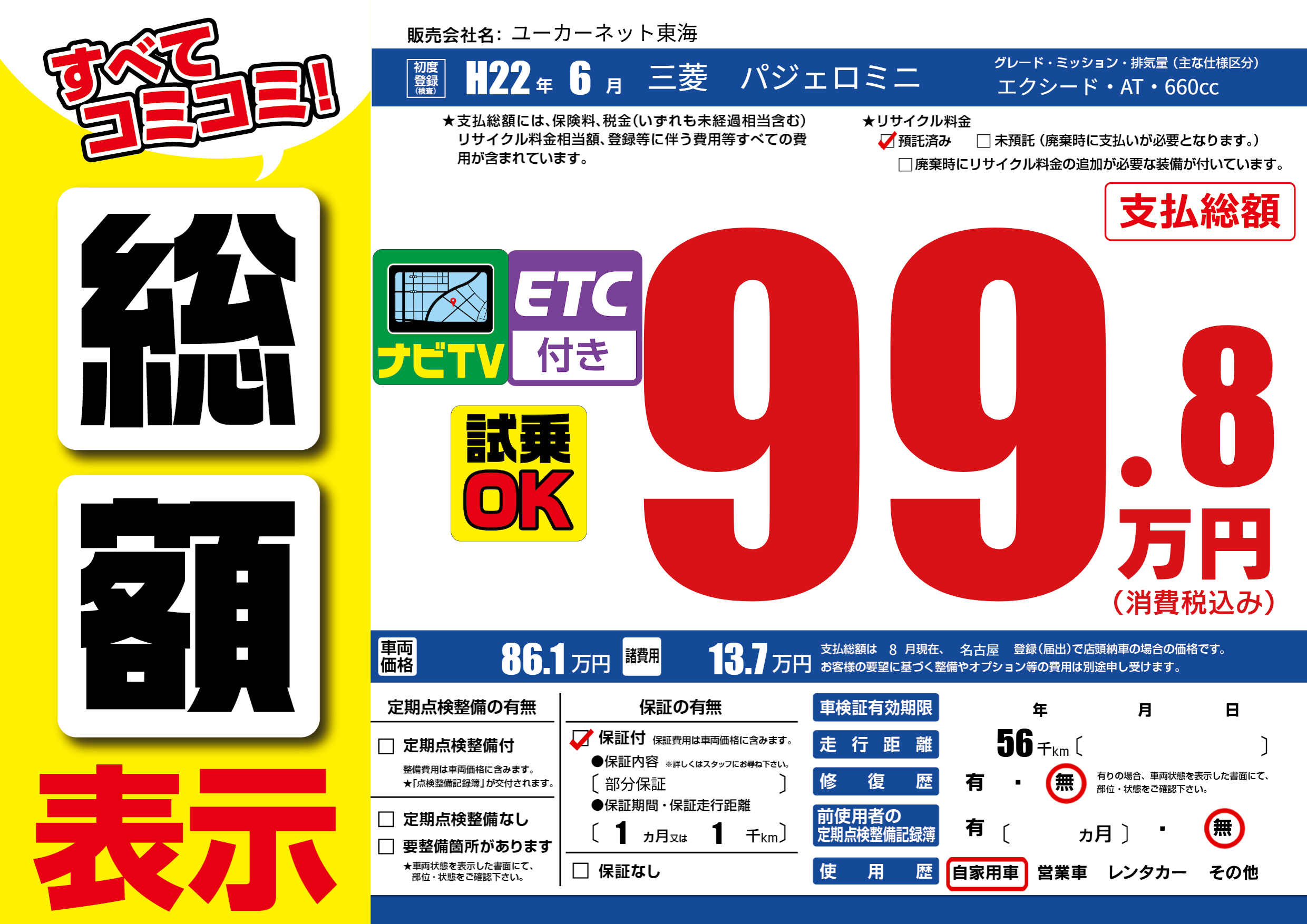 | 車名 | 三菱 パジェロミニ | グレード ミッション 排気量 |