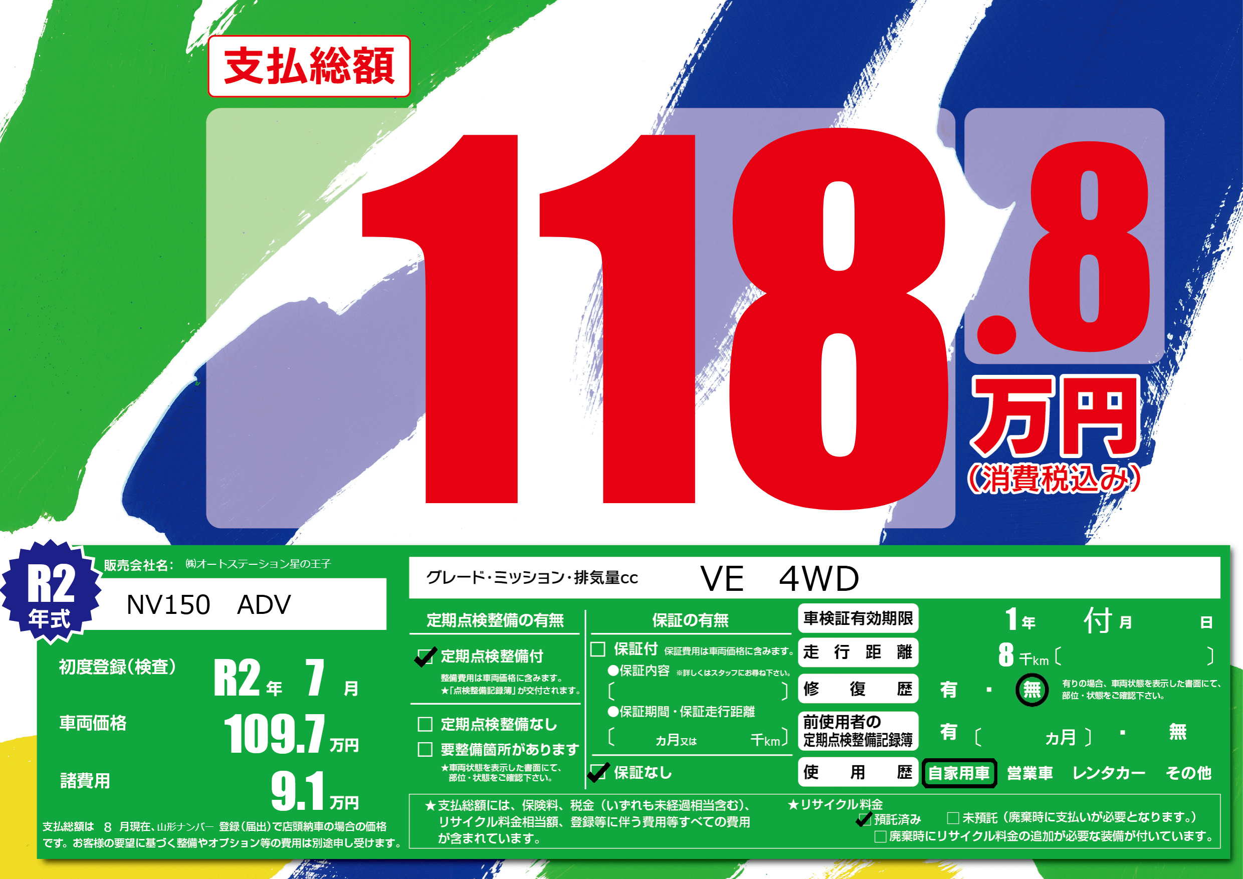 | 走行キロ | 0.8万km | 初年度登録 | R2年7月 |