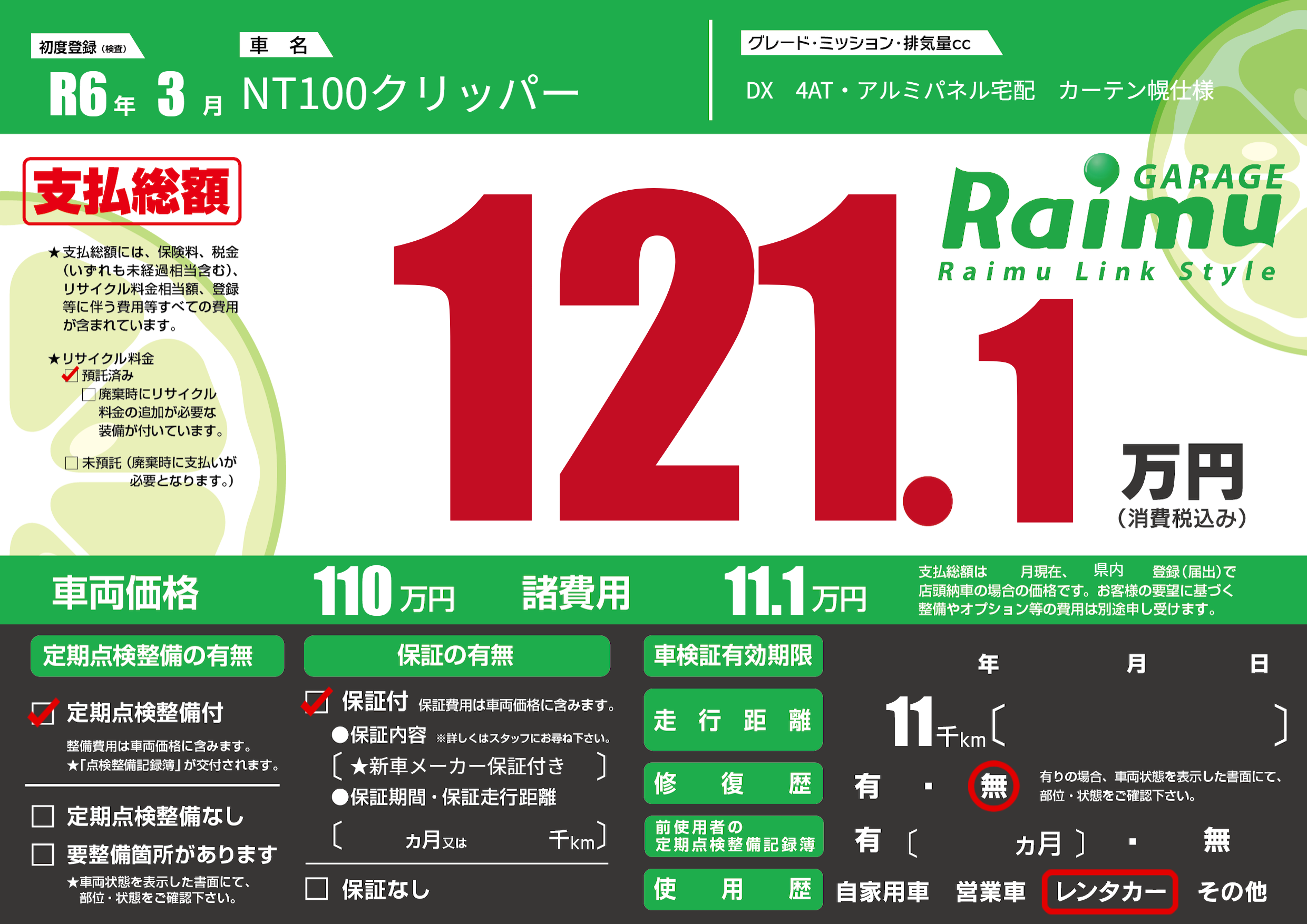 | 走行キロ | 1.1万km | 初年度登録 | R6年3月 |