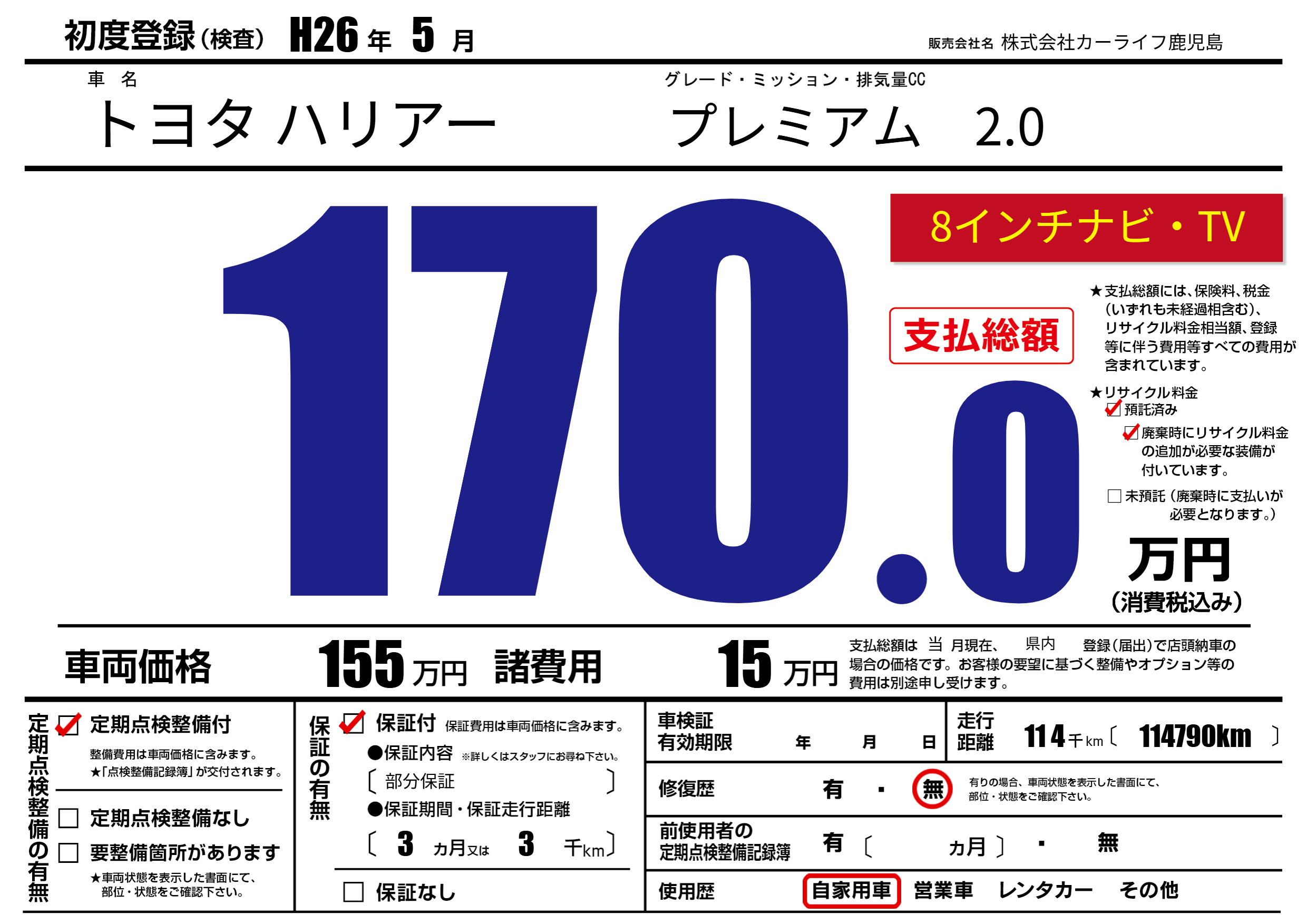 | 走行キロ | 1.1万km | 初年度登録 | H26年5月 |