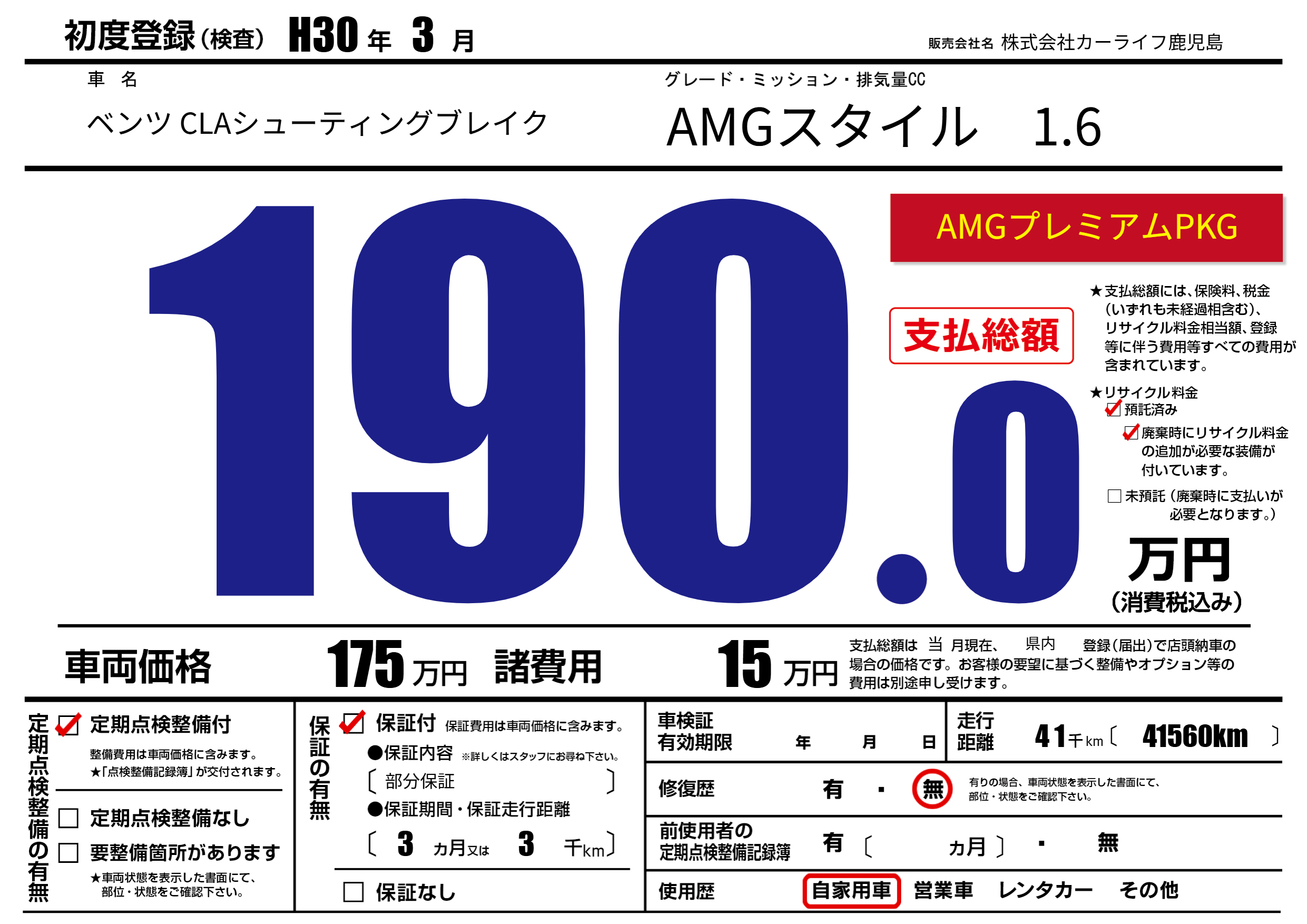 | 車名 | ベンツ CLAシューティングブレイク | グレード ミッション 排気量 |