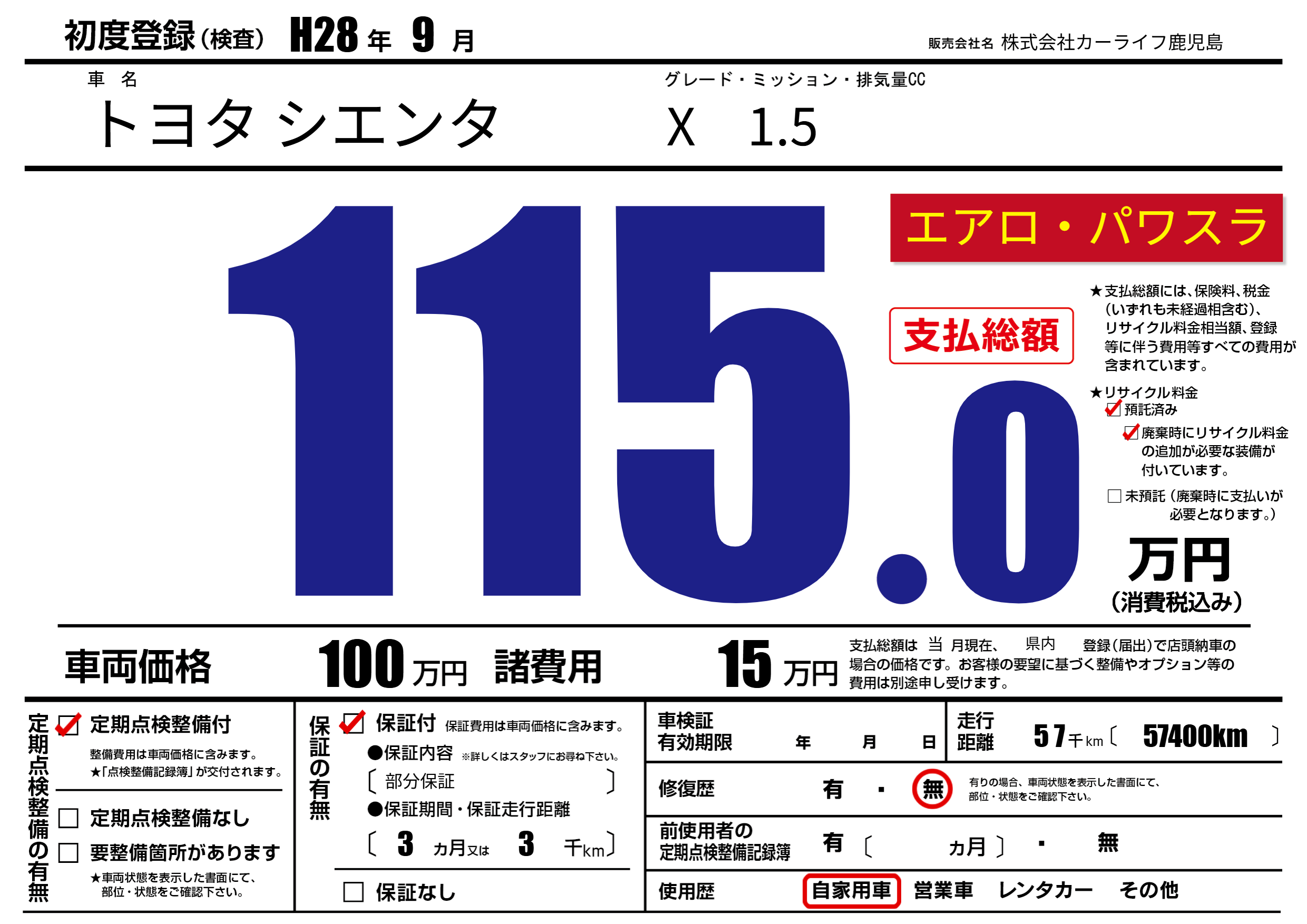 | 車名 | トヨタ シエンタ | グレード ミッション 排気量 |