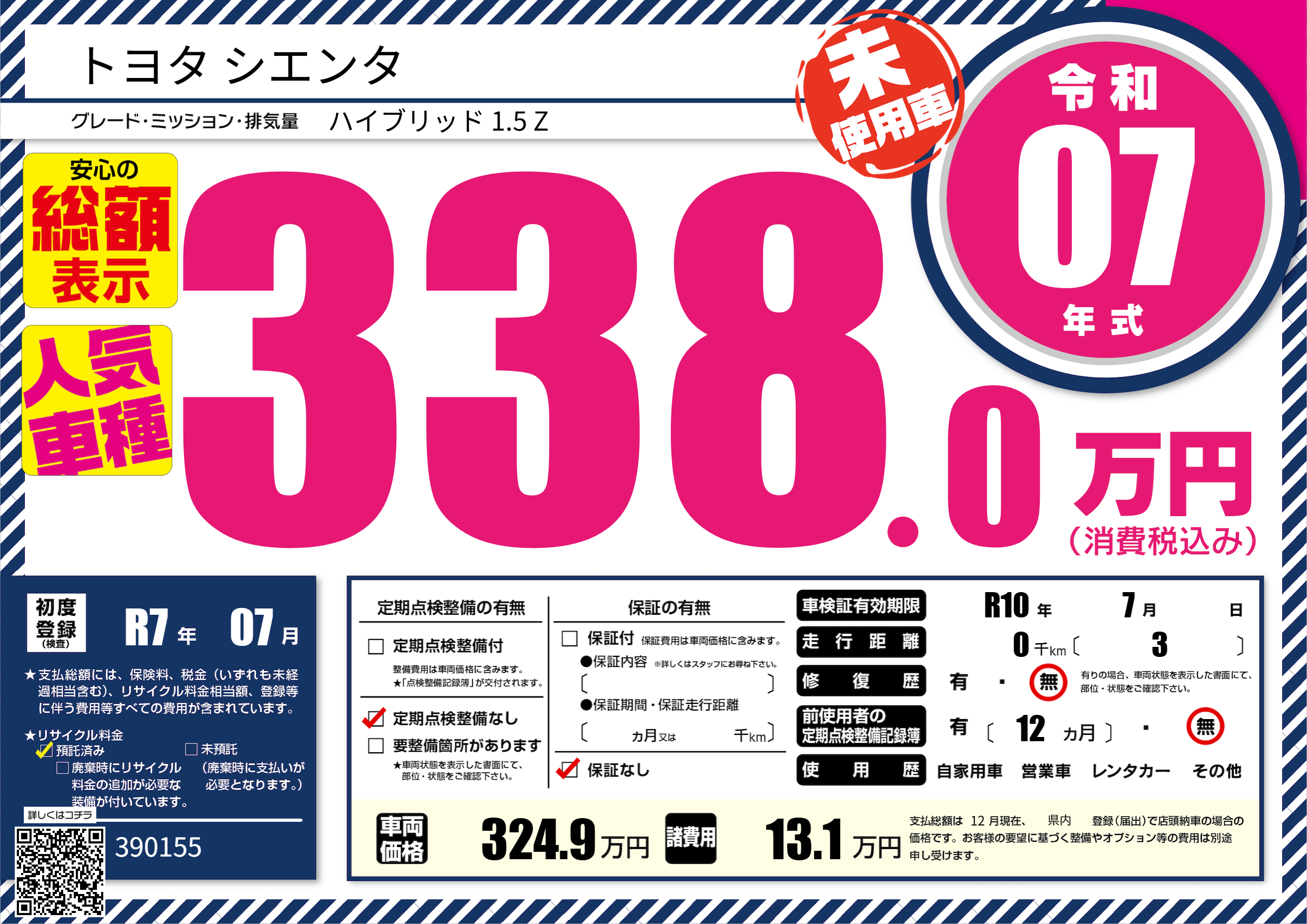 | 車名 | トヨタ シエンタ | グレード ミッション 排気量 |