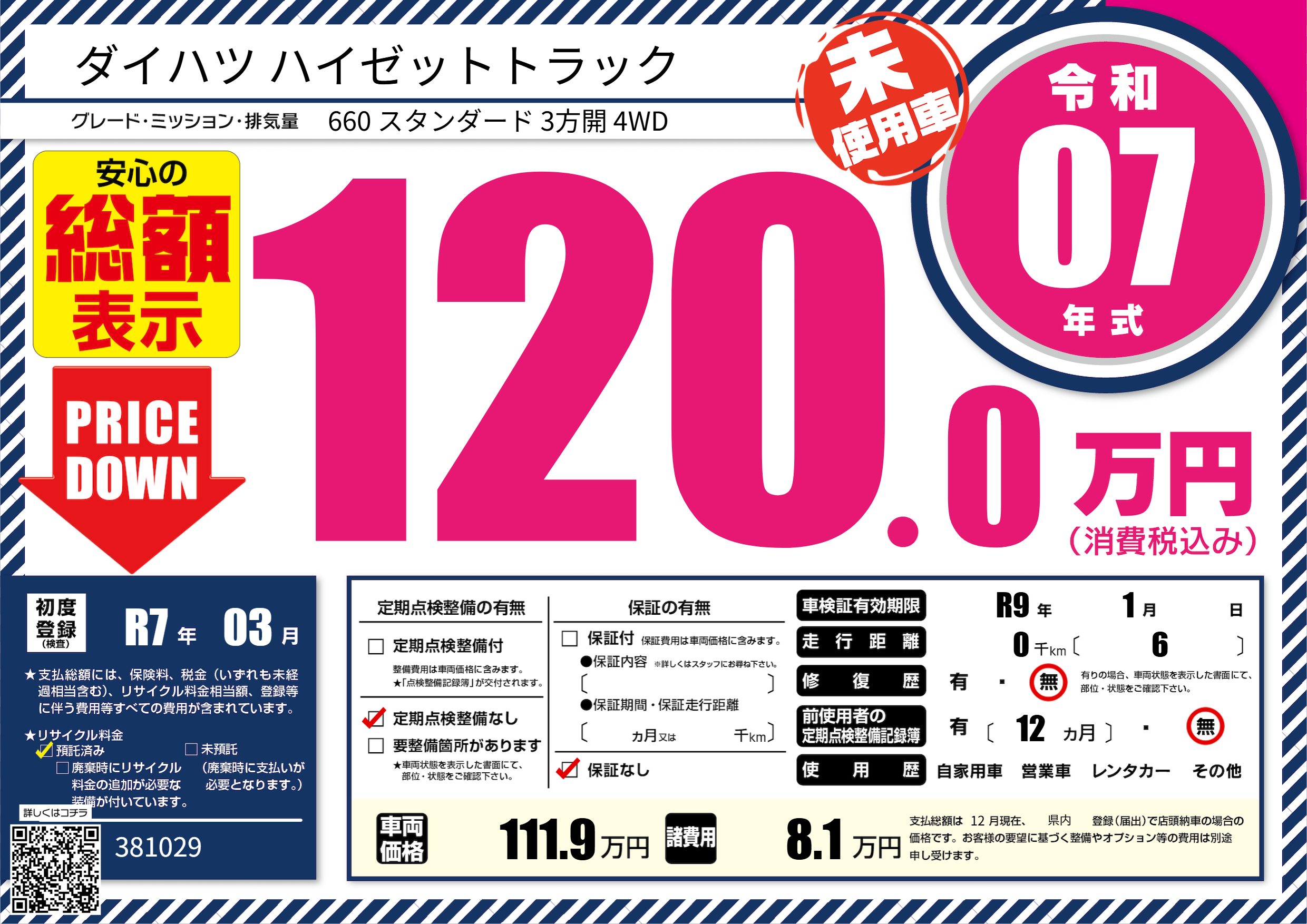 | 走行キロ | - | 初年度登録 | R7年03月 |
