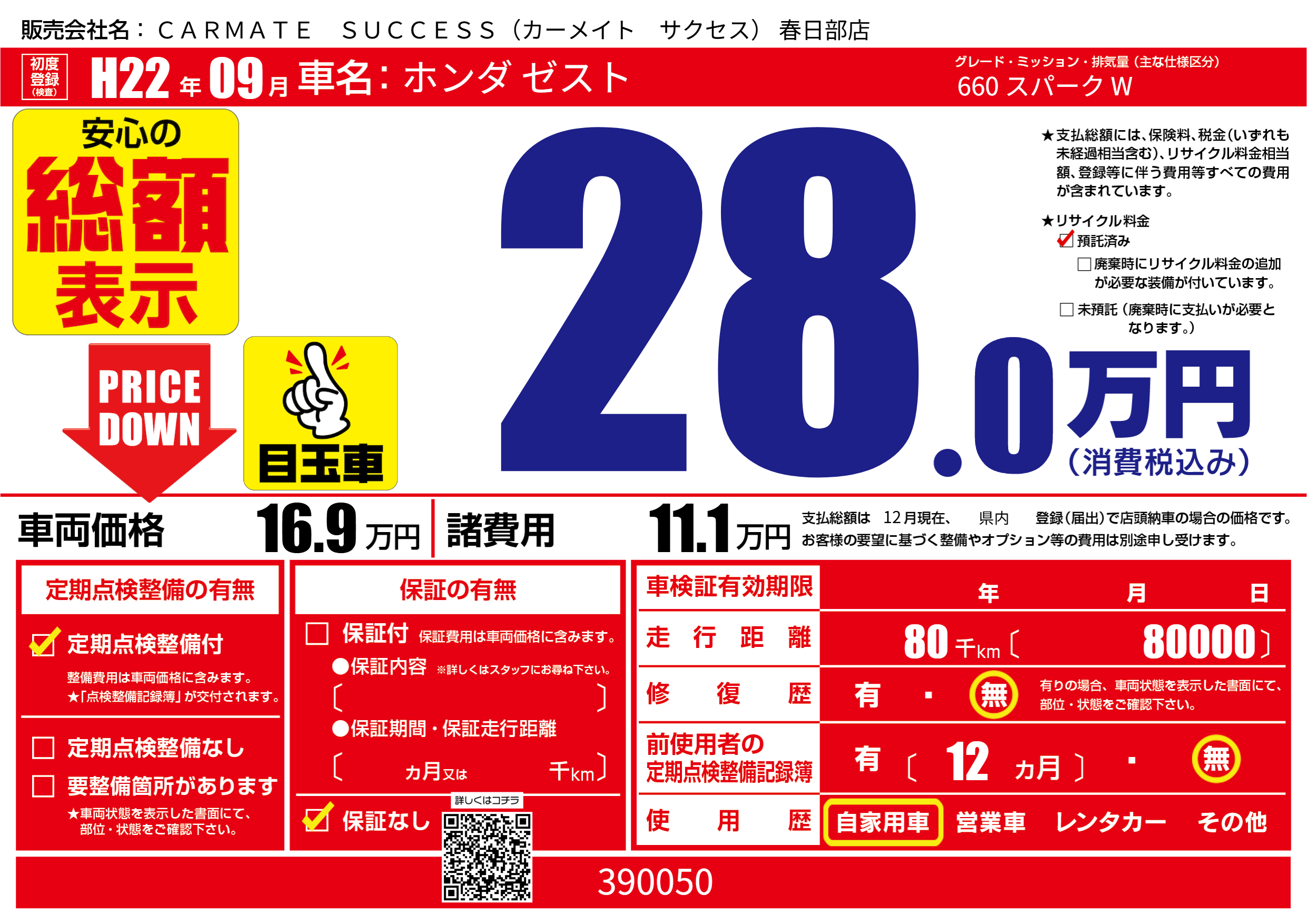 | 走行キロ | 8万km | 初年度登録 | H22年09月 |