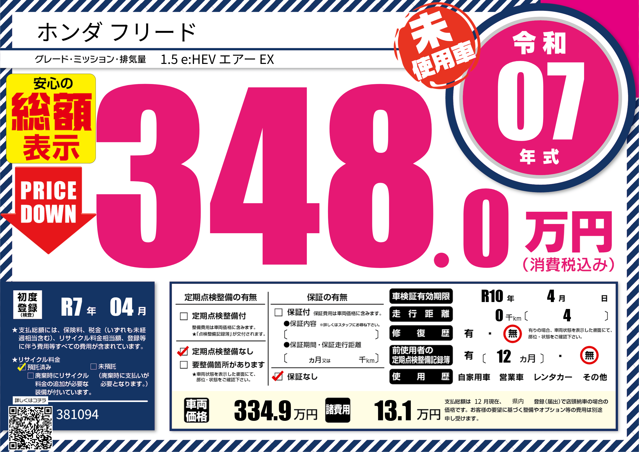 | 車名 | ホンダ フリード | グレード ミッション 排気量 |