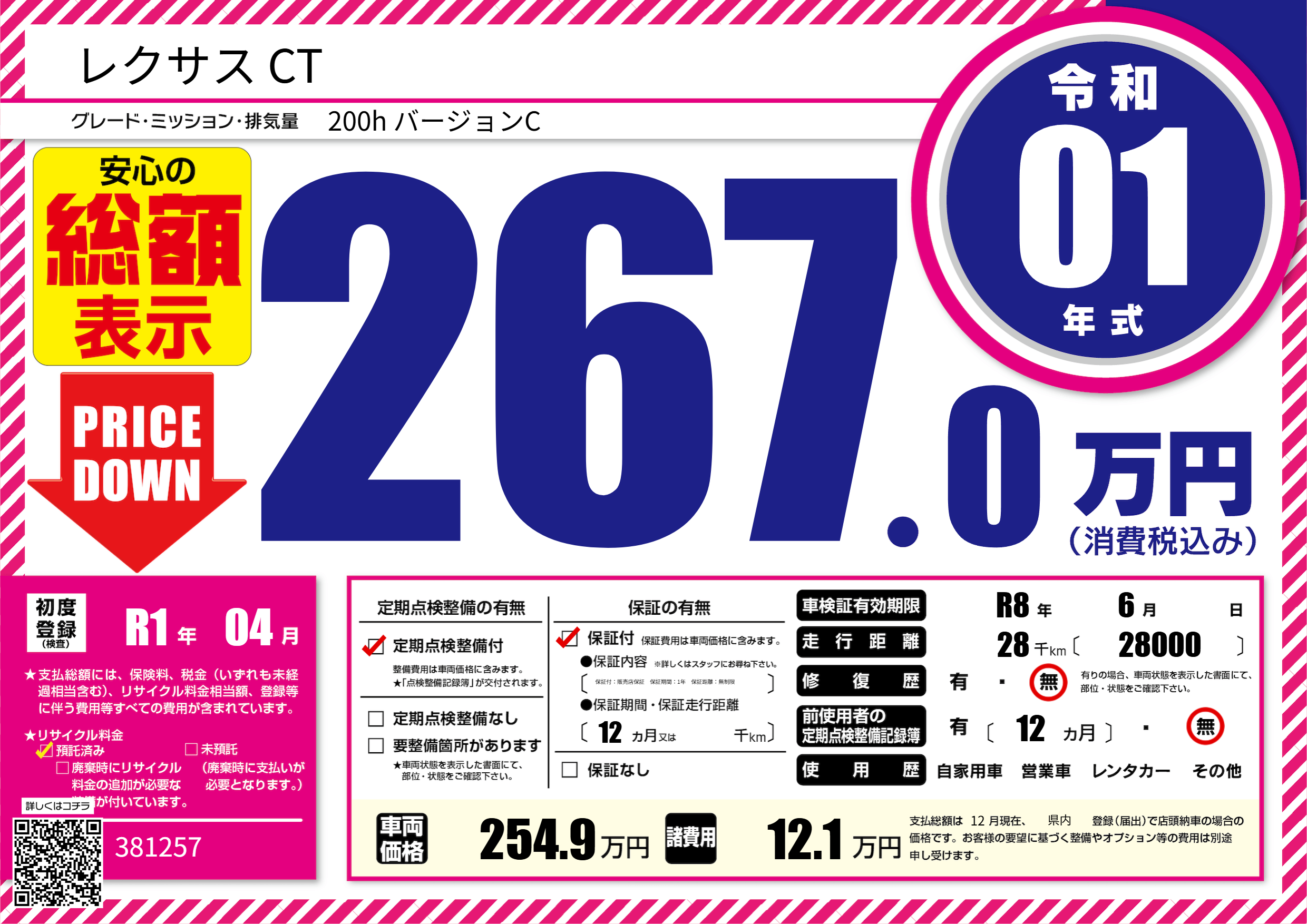 | 車名 | レクサス CT | グレード ミッション 排気量 |