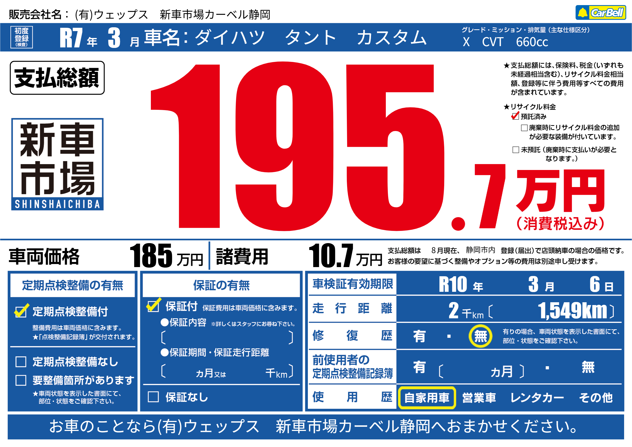| 走行キロ | 0.2万km | 初年度登録 | R7年3月 |