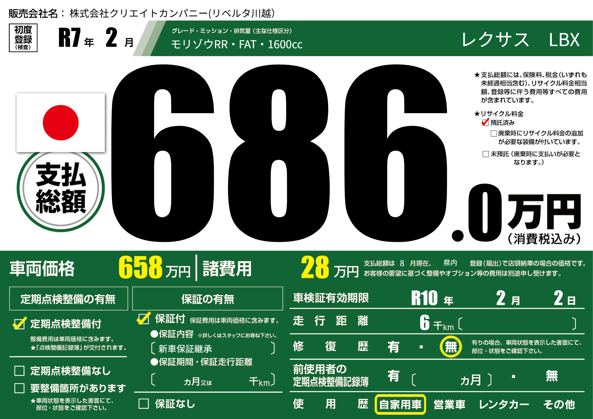 | 走行キロ | 0.6万km | 初年度登録 | R7年2月 |