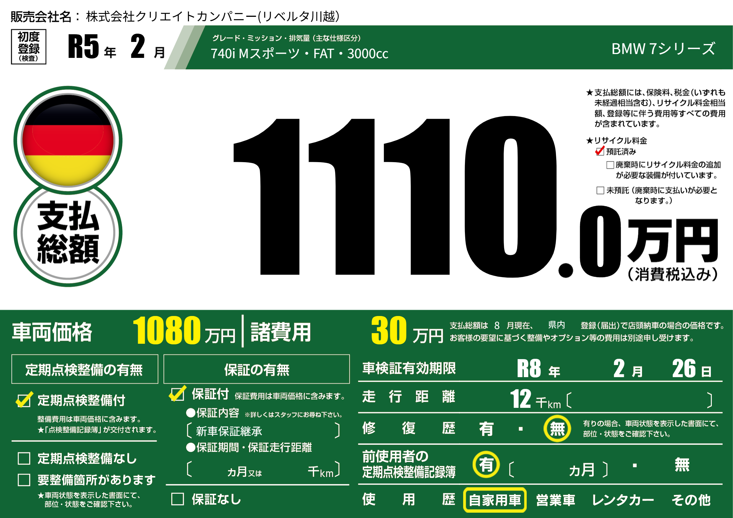 | 車名 | BMW 7シリーズ | グレード ミッション 排気量 |
