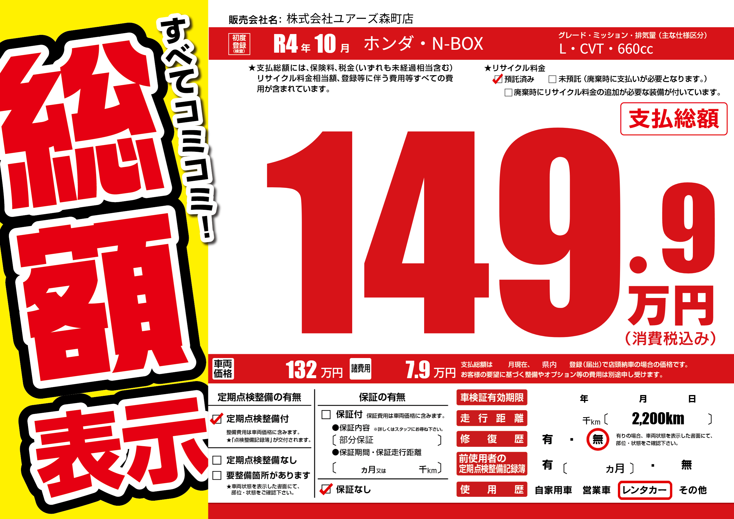 | 走行キロ | - | 初年度登録 | R4年10月 |