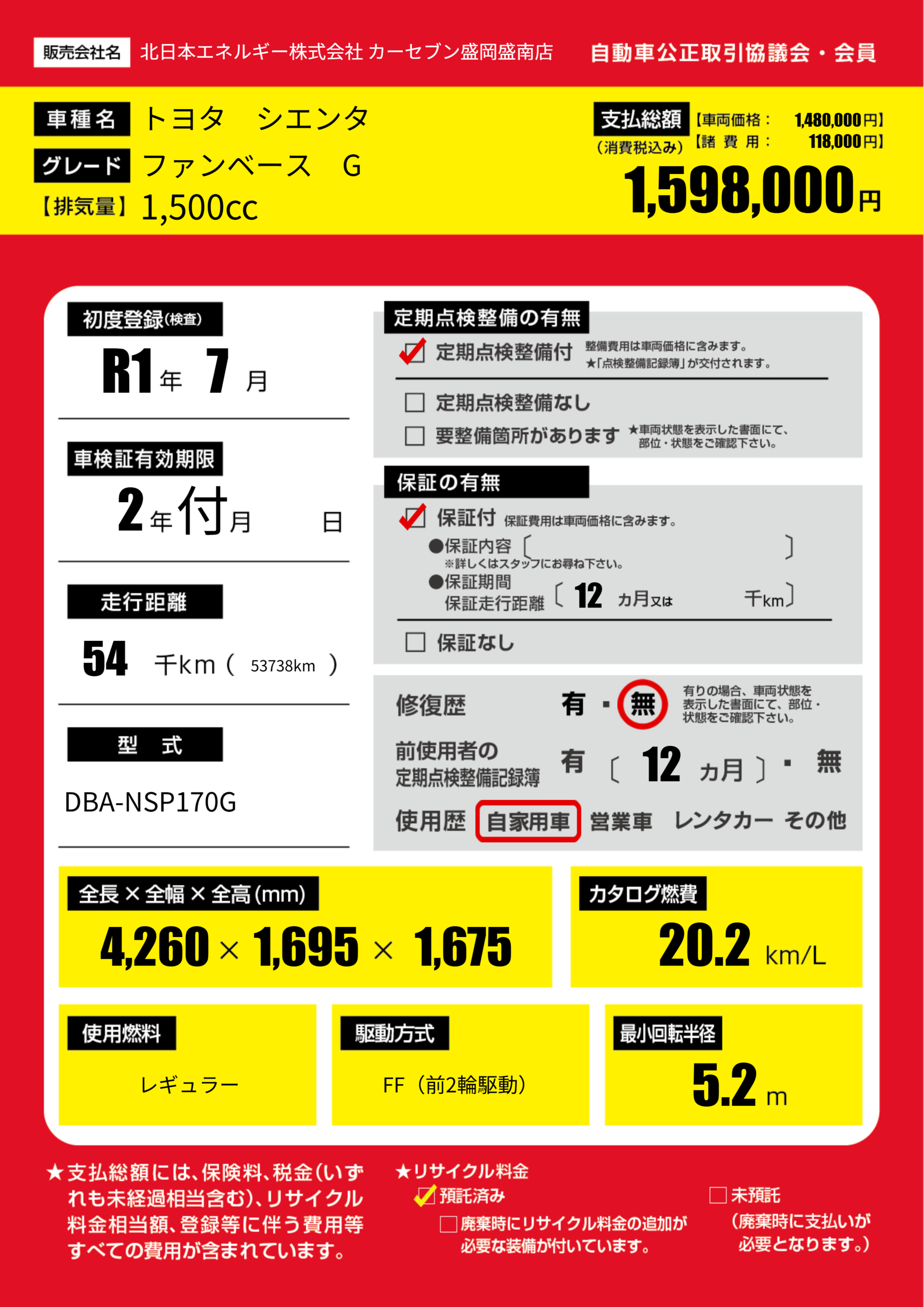 | 車名 | トヨタ シエンタ | グレード ミッション 排気量 |