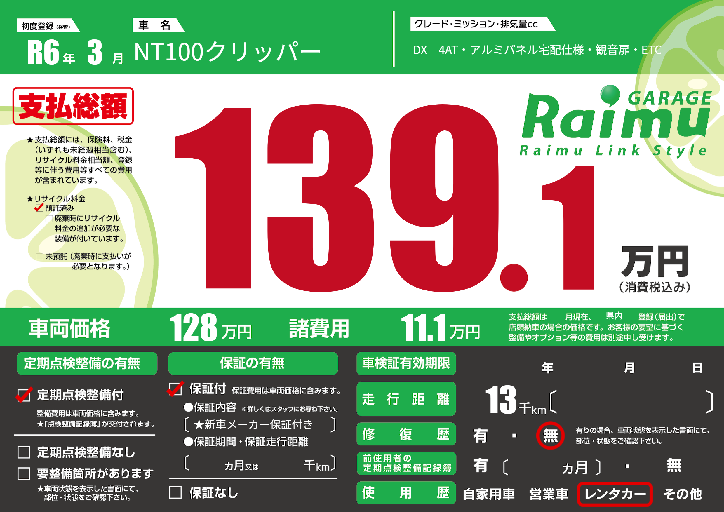 | 走行キロ | 1.3万km | 初年度登録 | R6年3月 |