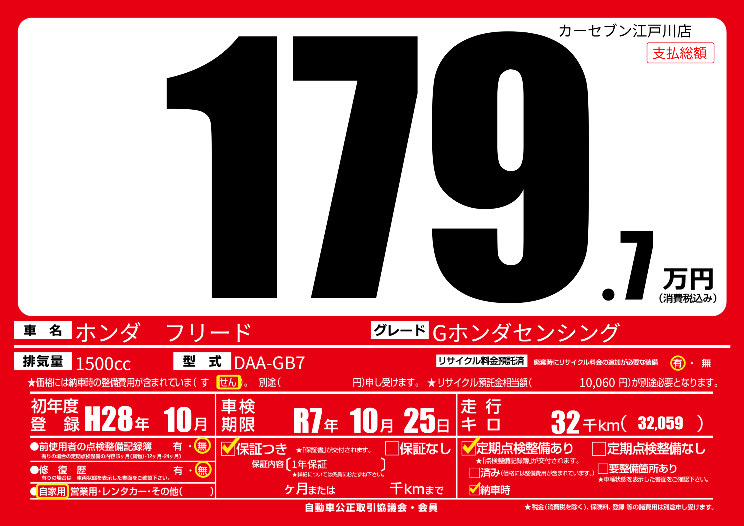 | 車名 | ホンダ フリード | グレード ミッション 排気量 |