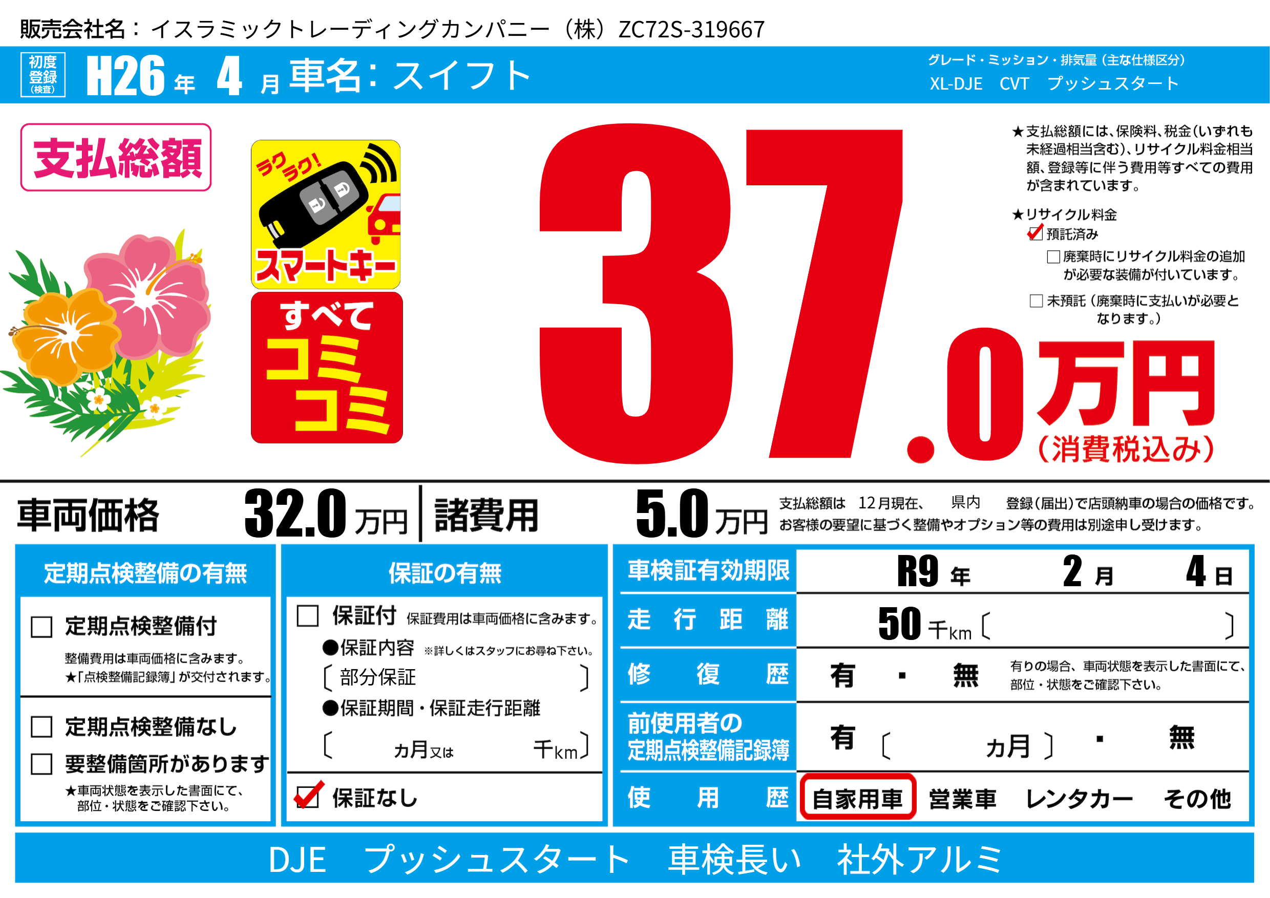 | 走行キロ | 5万km | 初年度登録 | H26年4月 |