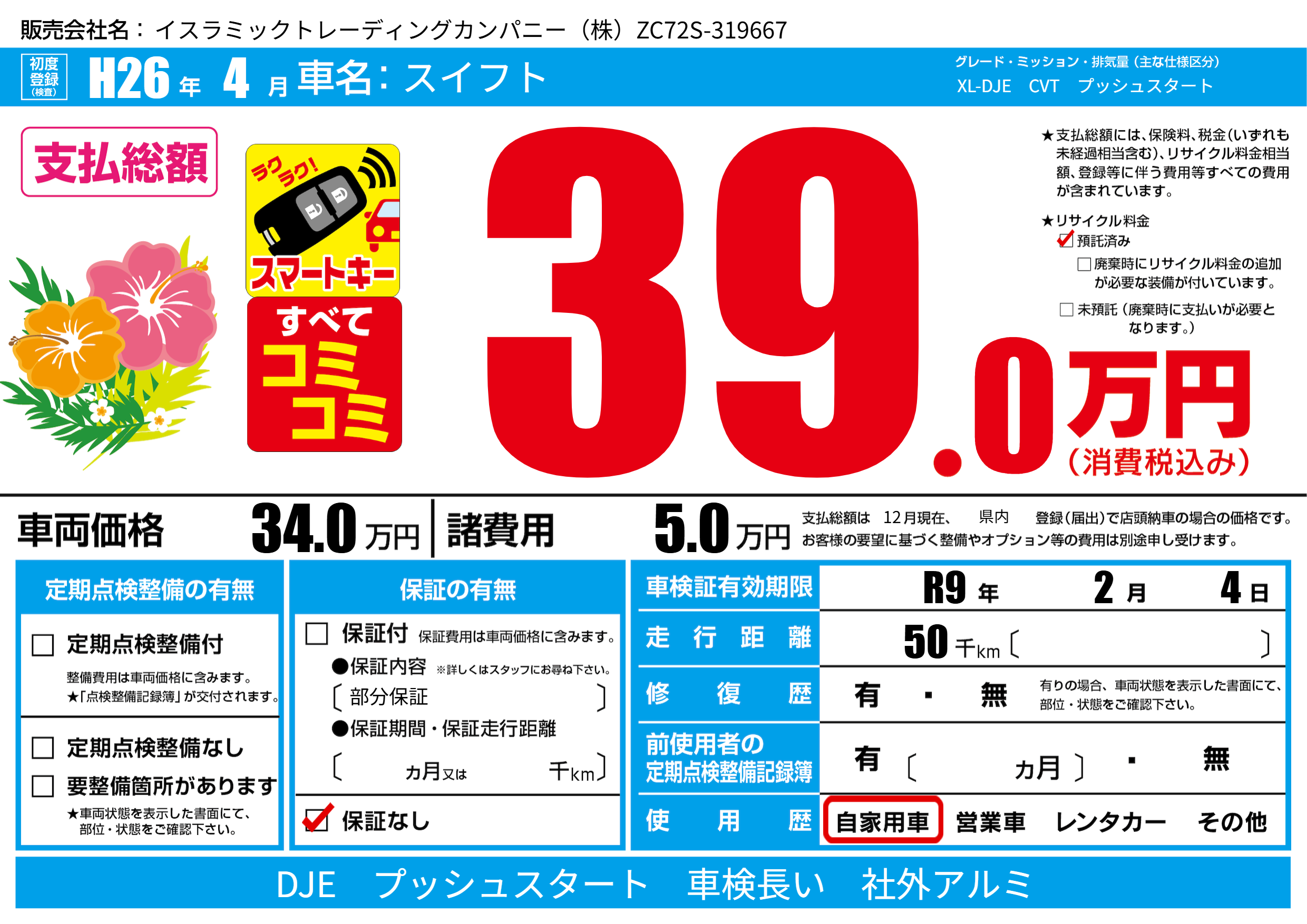 | 走行キロ | 5万km | 初年度登録 | H26年4月 |
