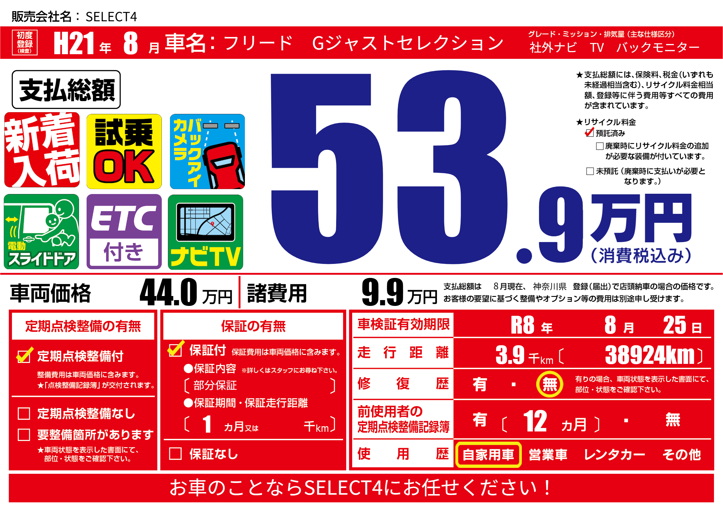 | 車名 | フリード Gジャストセレクション | グレード ミッション 排気量 |