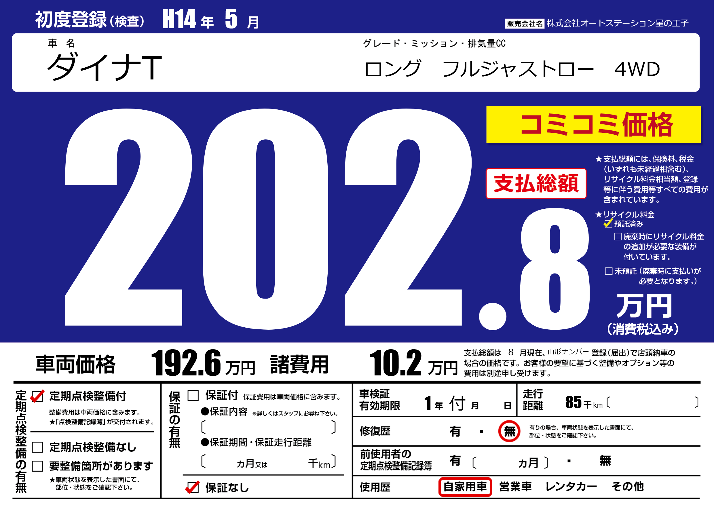 | 走行キロ | 8.5万km | 初年度登録 | H14年5月 |