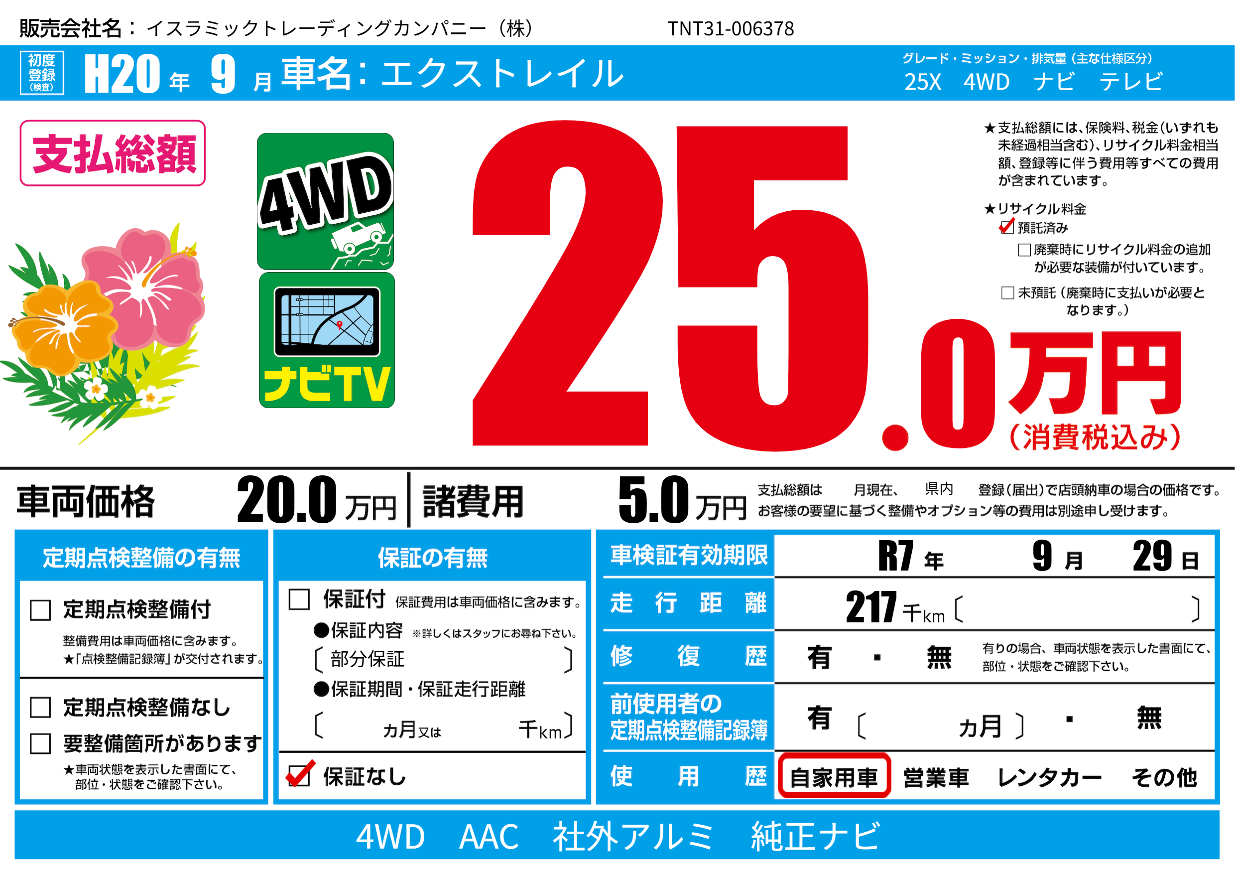 | 走行キロ | 21.7万km | 初年度登録 | H20年9月 |
