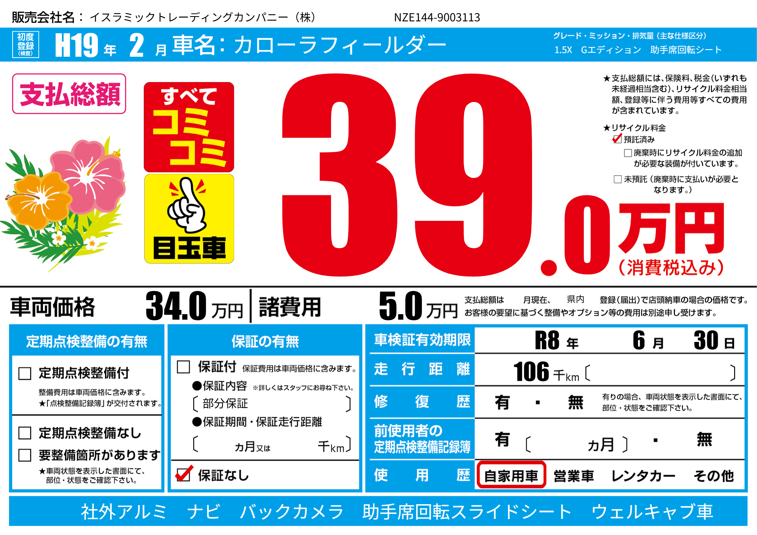 | 車名 | カローラフィールダー | グレード ミッション 排気量 |