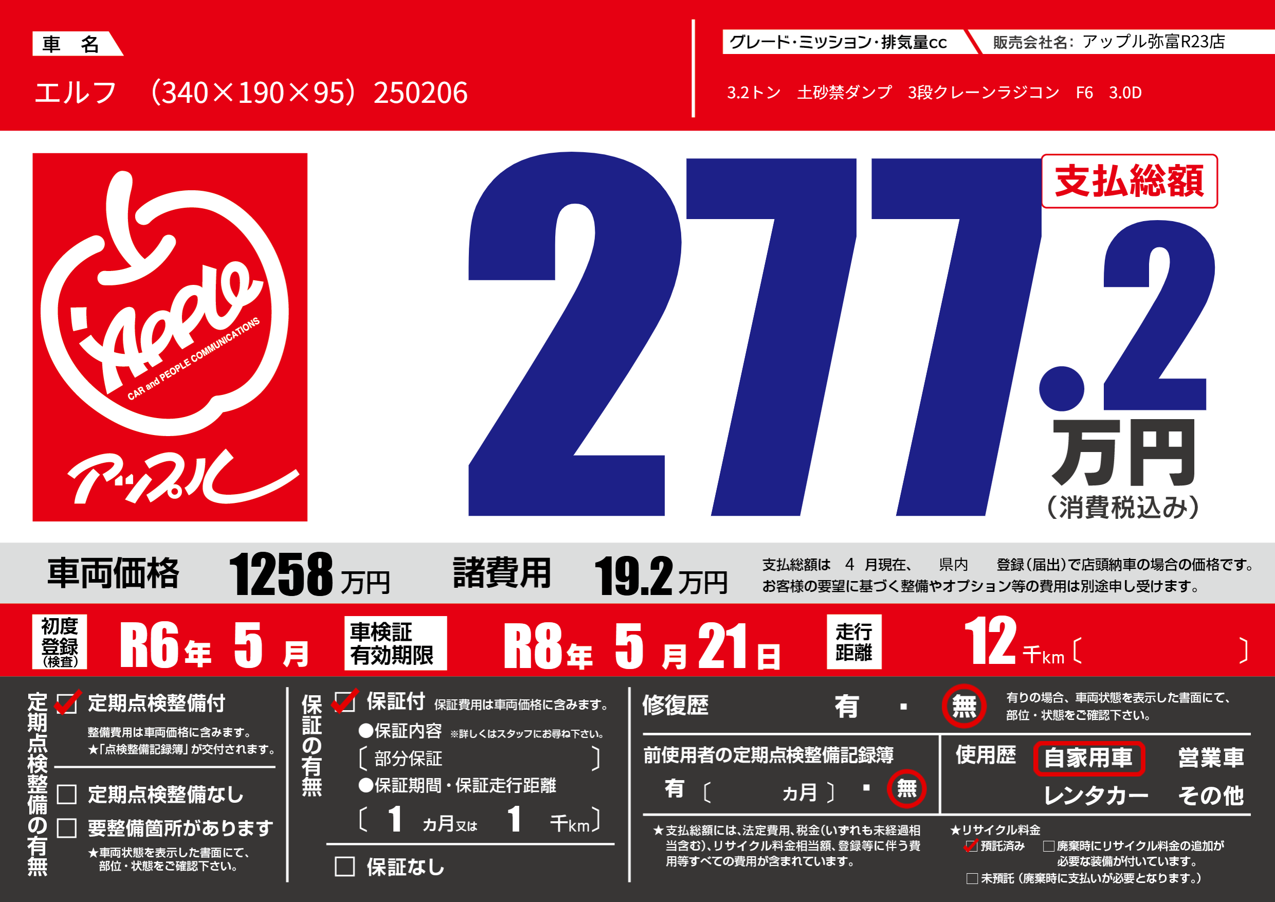 | 車名 | エルフ (340×190×95)250206 | グレード ミッション 排気量 |