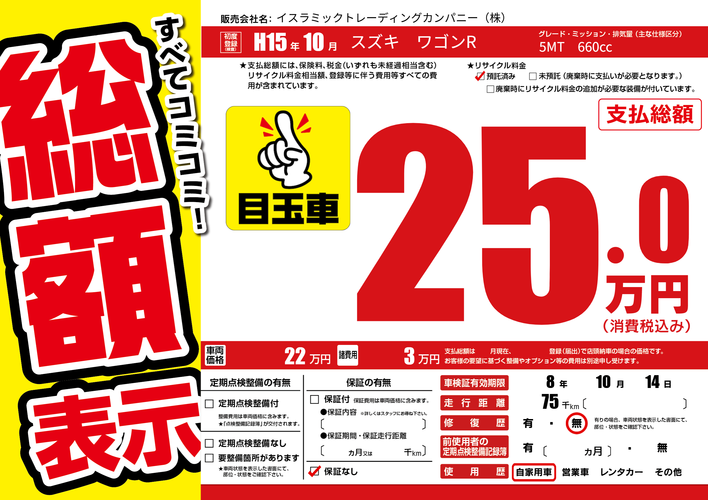 | 走行キロ | 7.5万km | 初年度登録 | H15年10月 |