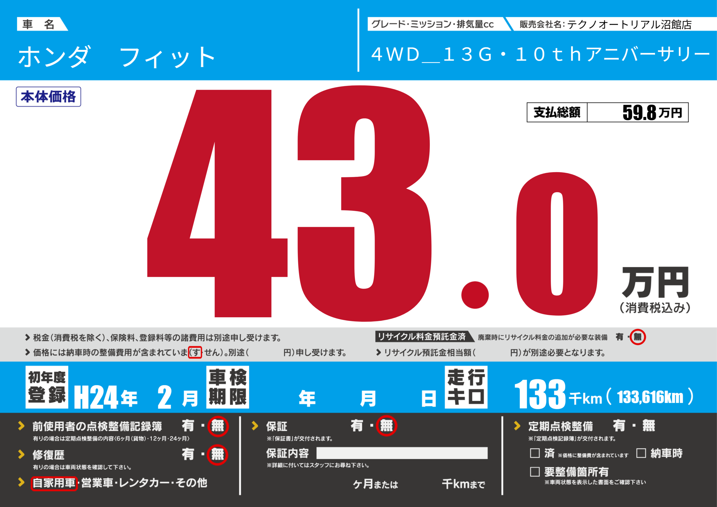 | 車名 | ホンダ フィット | グレード ミッション 排気量 |