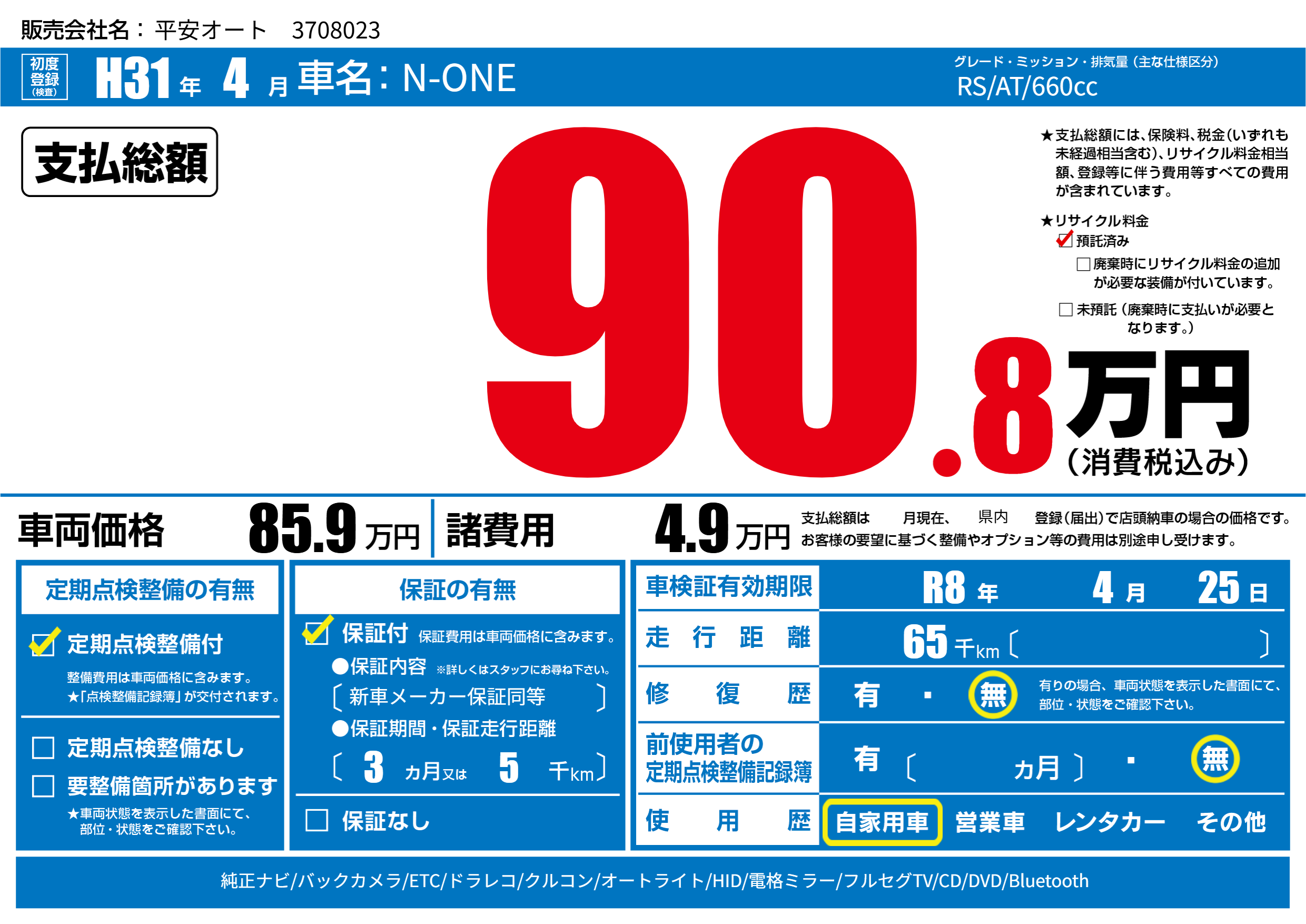 | 車名 | N-ONE | グレード ミッション 排気量 |