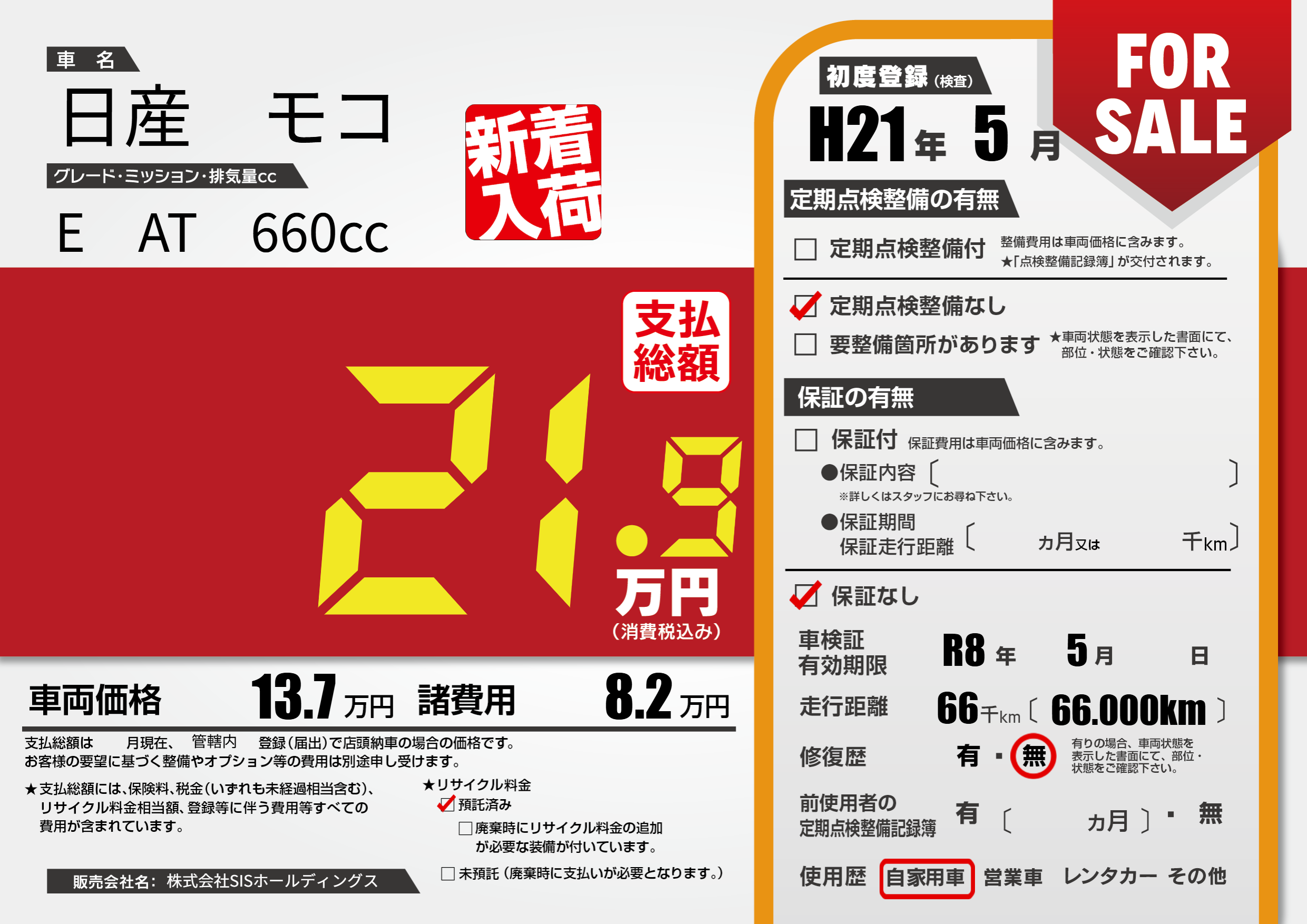 | 車名 | 日産 モコ | グレード ミッション 排気量 |