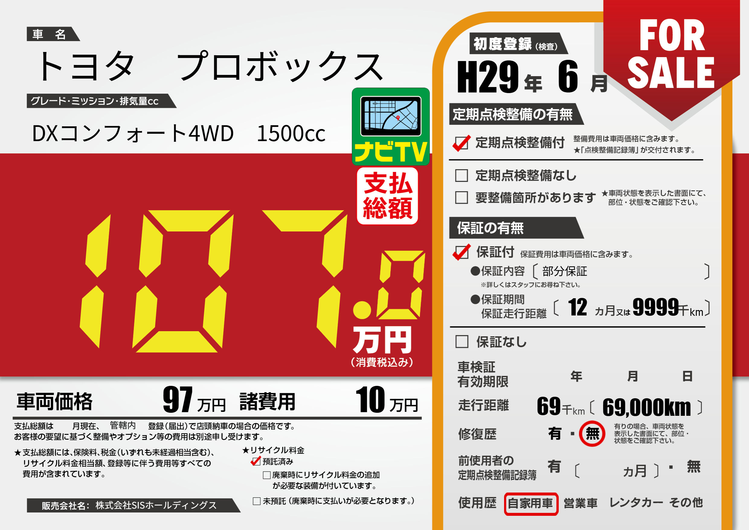 | 車名 | トヨタ プロボックス | グレード ミッション 排気量 |