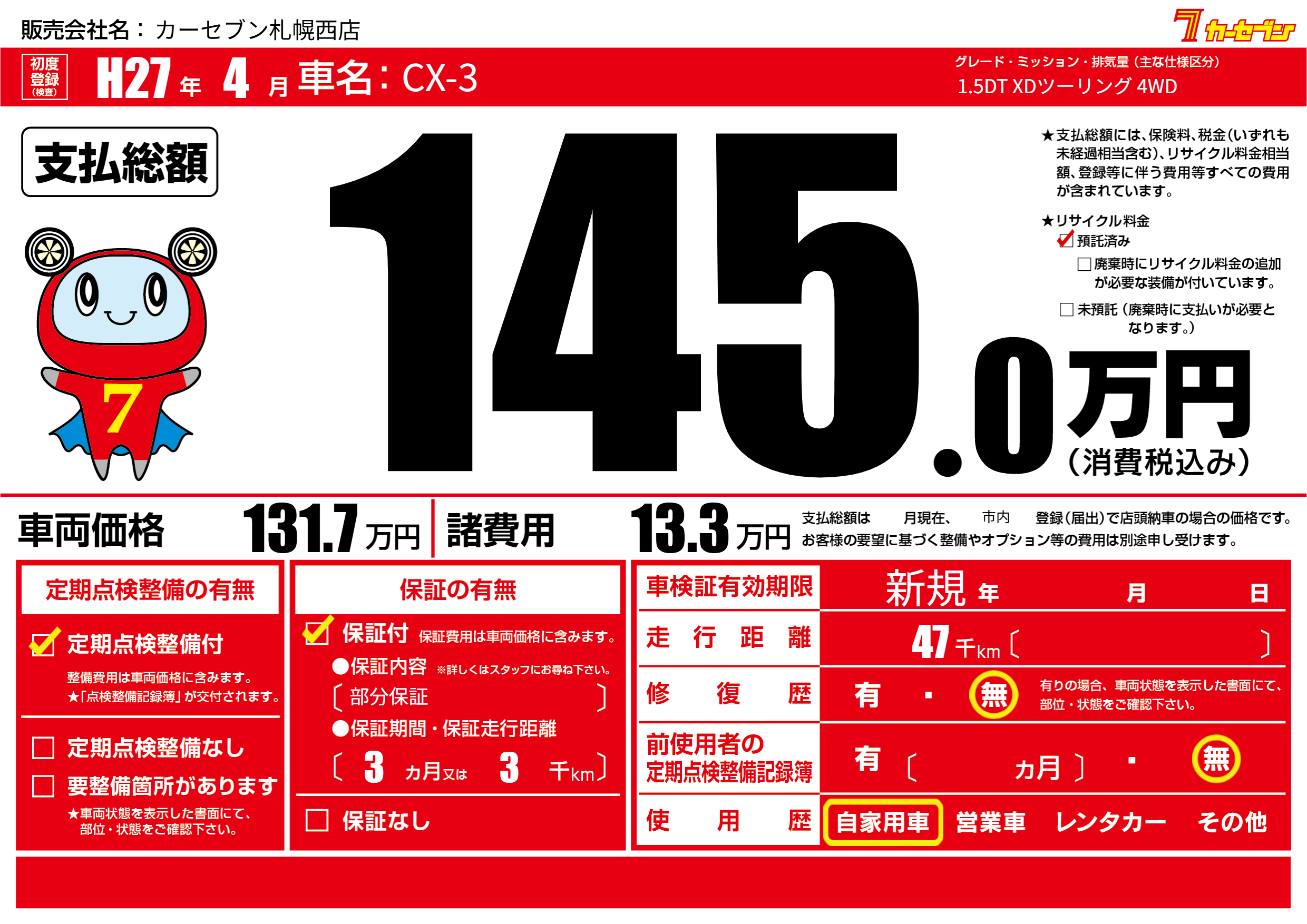 | 車名 | CX-3 | グレード ミッション 排気量 |