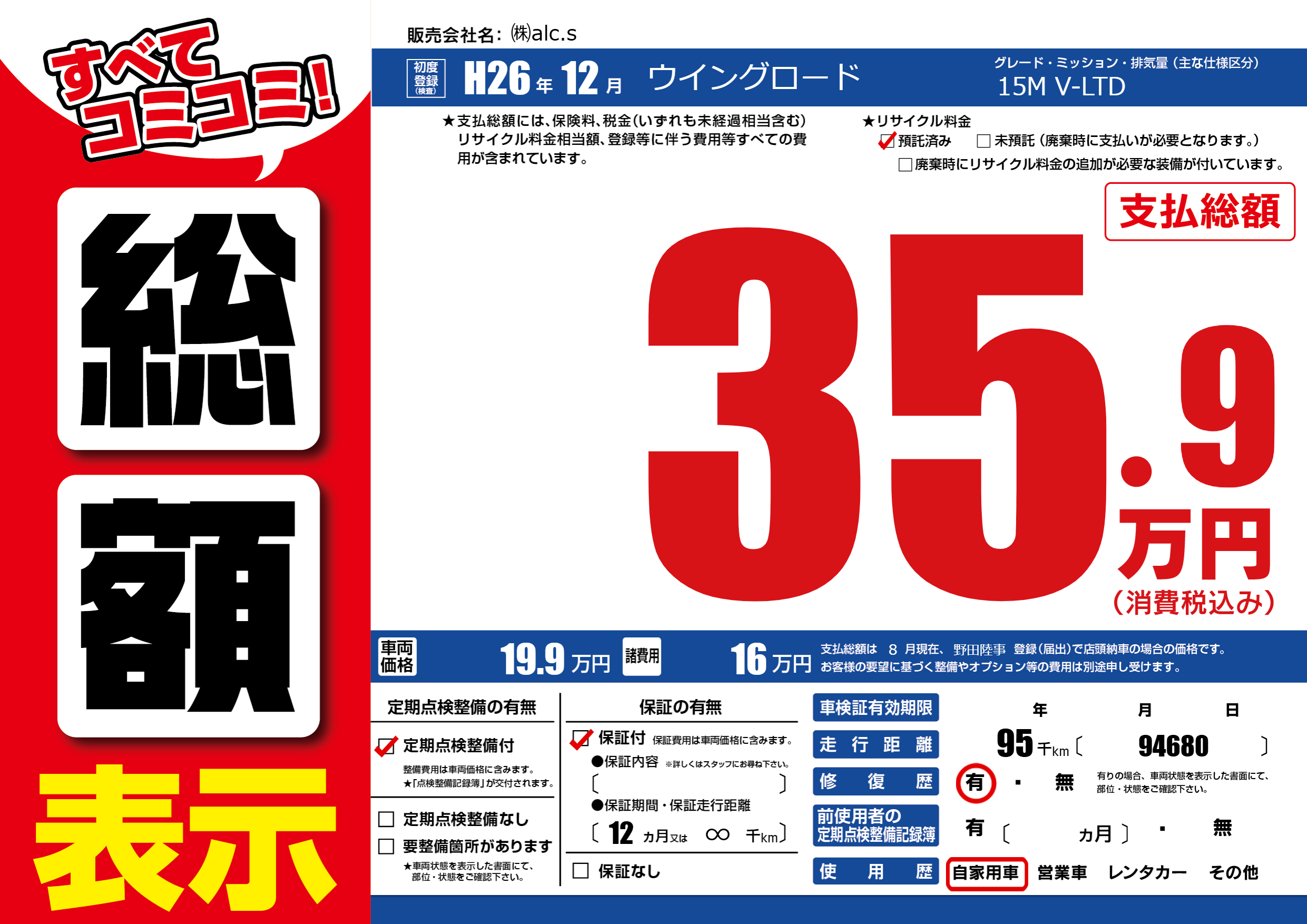 | 走行キロ | 9.5万km | 初年度登録 | H26年12月 |