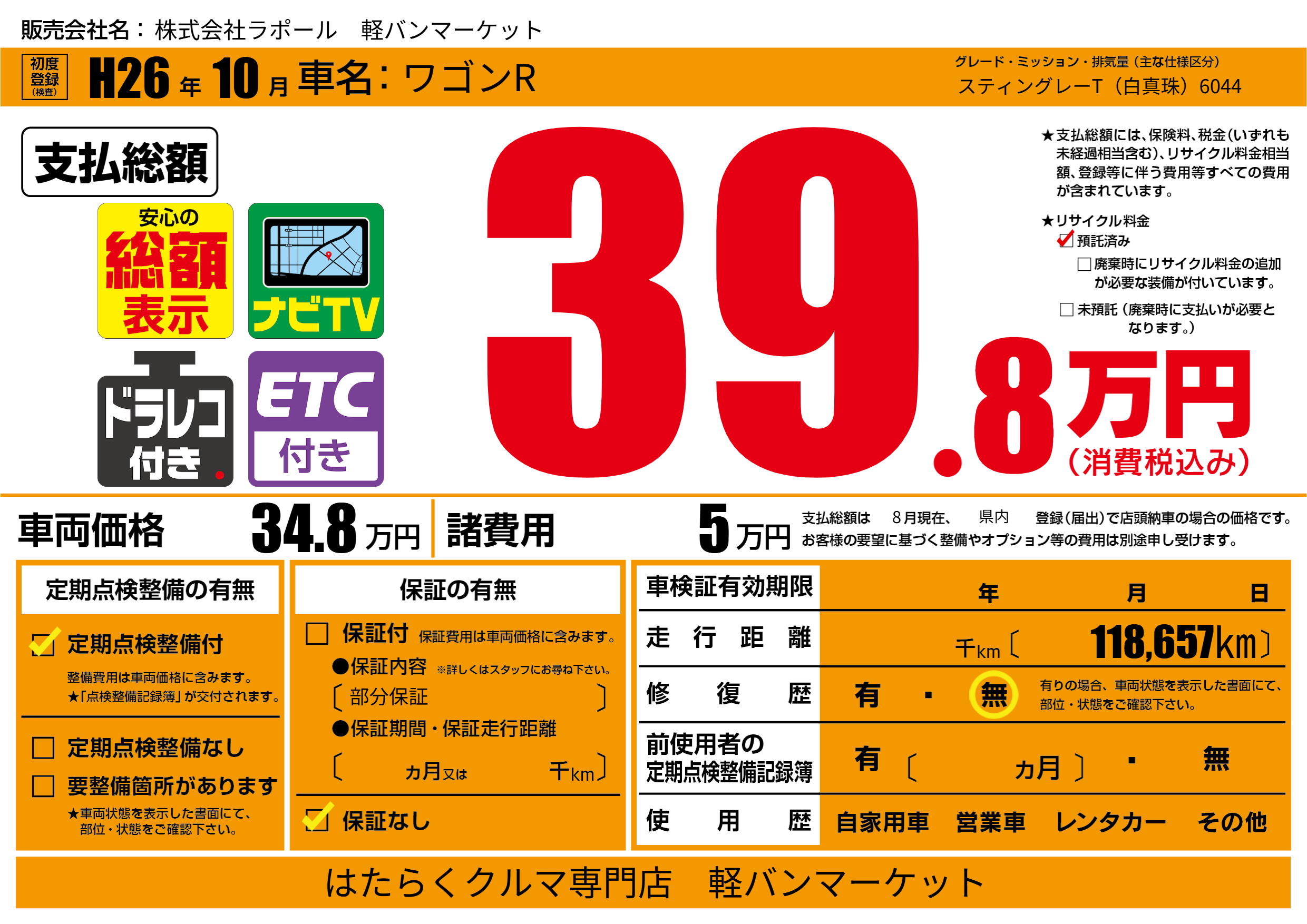 保証なし 保証内容(部分保証) ---ヶ月または()千kmまで |