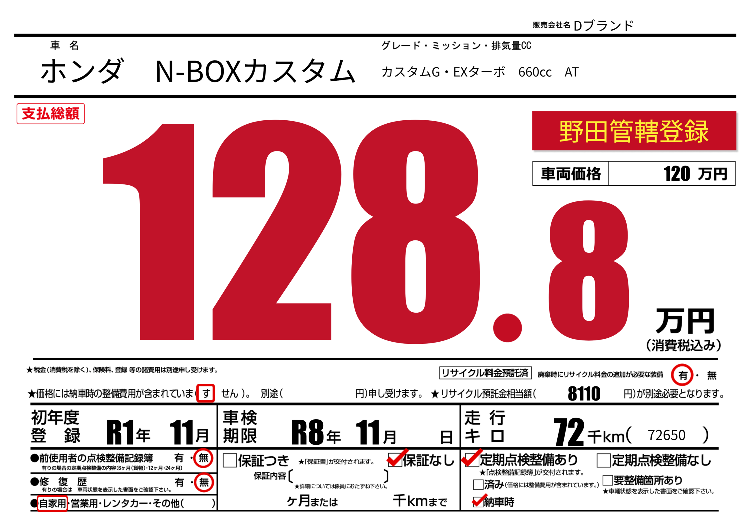 あり | 車検制限 | R8年11月---月 |