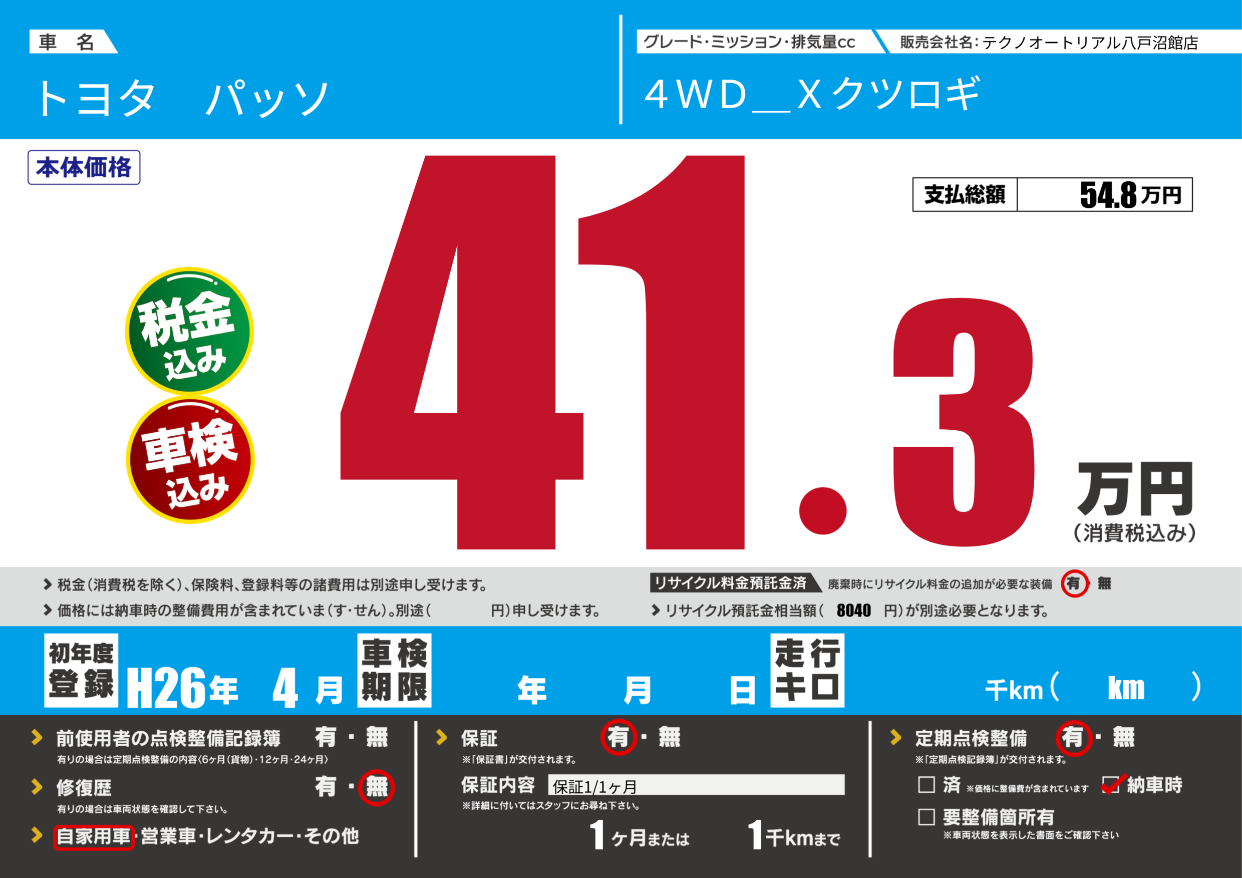 | 車名 | トヨタ パッソ | グレード ミッション 排気量 |