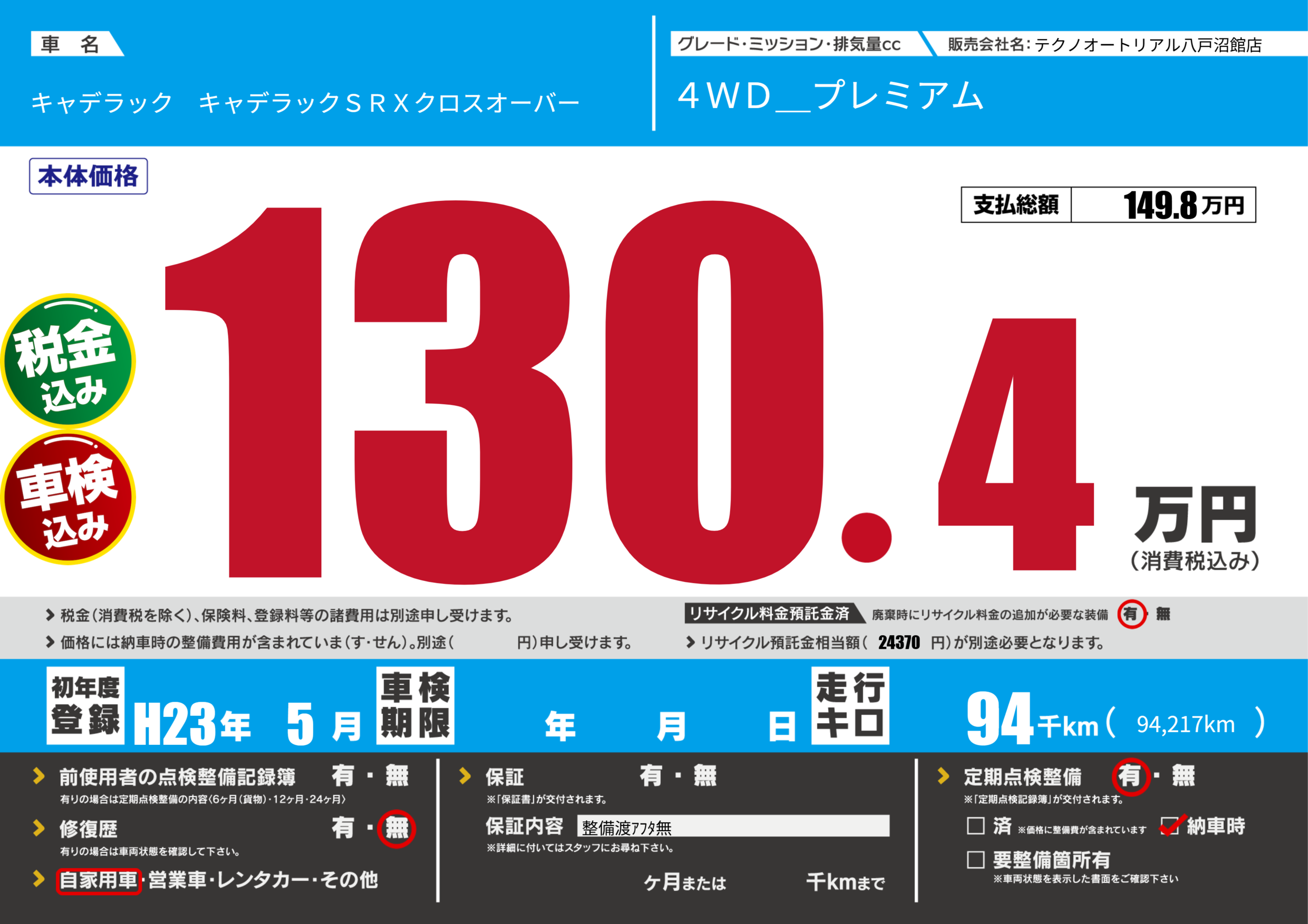 | 走行キロ | 9.4万km | 初年度登録 | H23年5月 |
