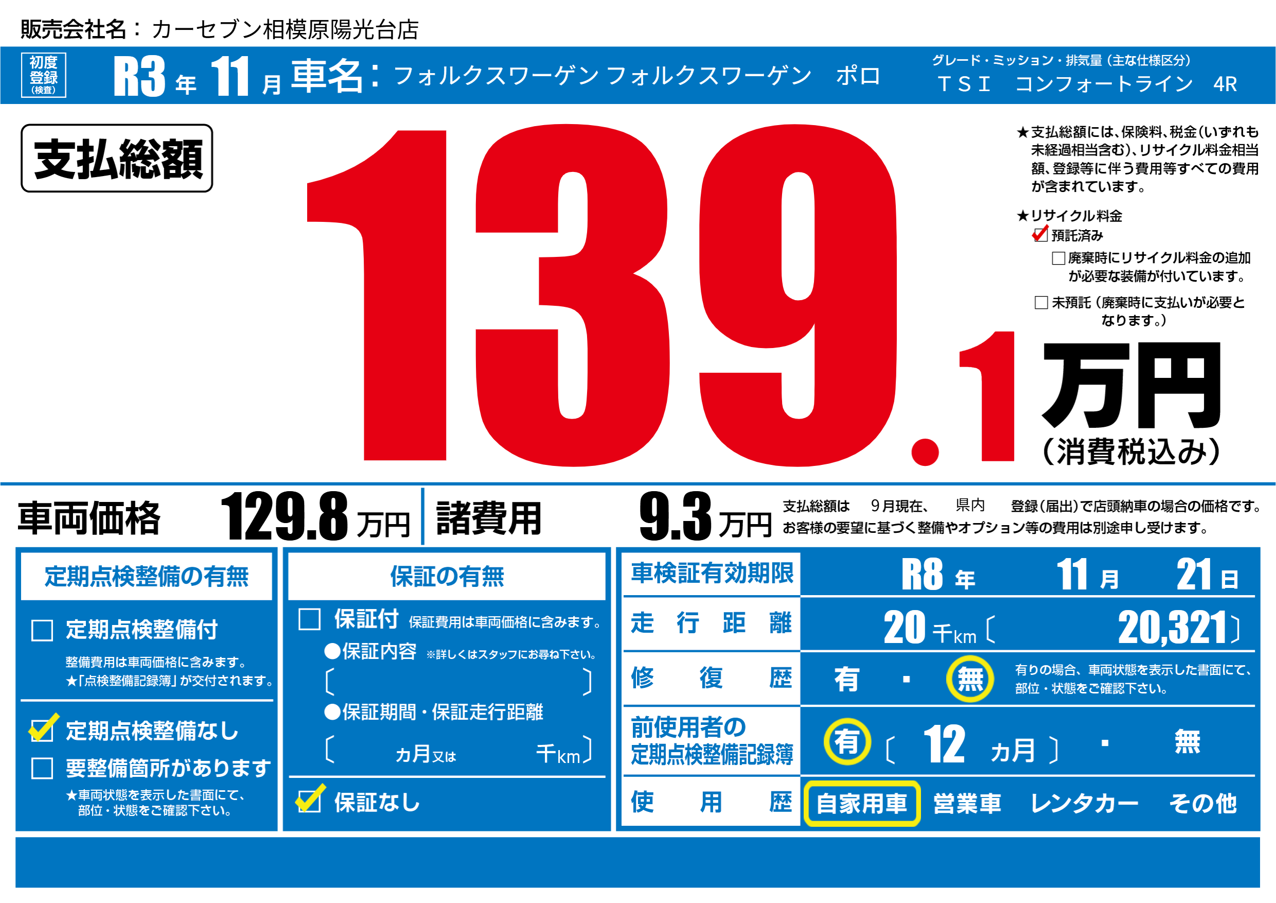| 車名 | フォルクスワーゲン フォルクスワーゲン ポロ | グレード ミッション 排気量 |