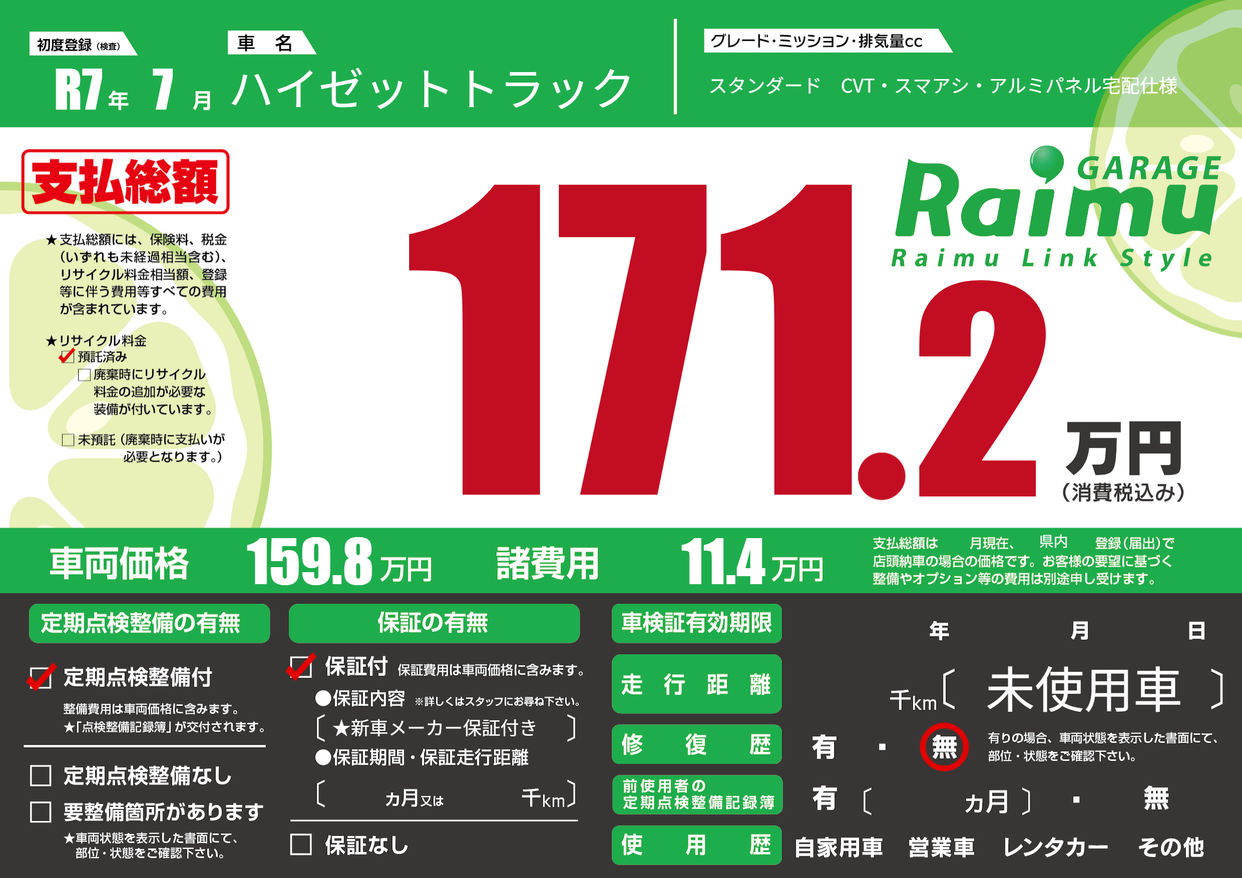 保証付き 保証内容(★新車メーカー保証付き) ---ヶ月または()千kmまで |
