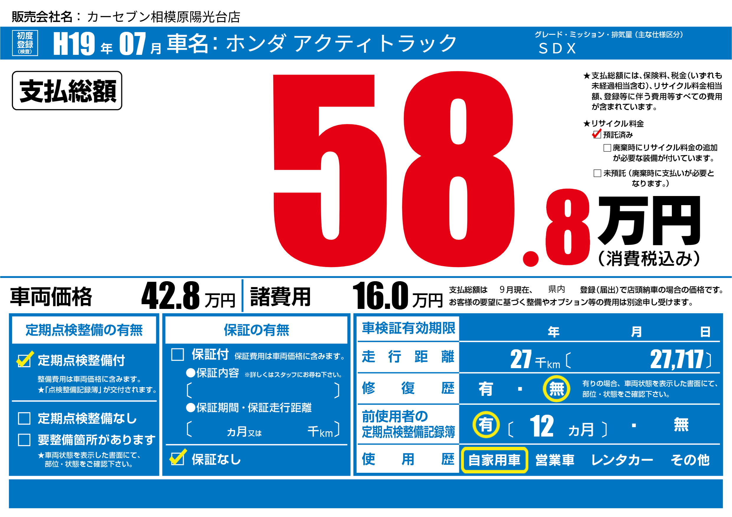 | 車名 | ホンダ アクティトラック | グレード ミッション 排気量 |
