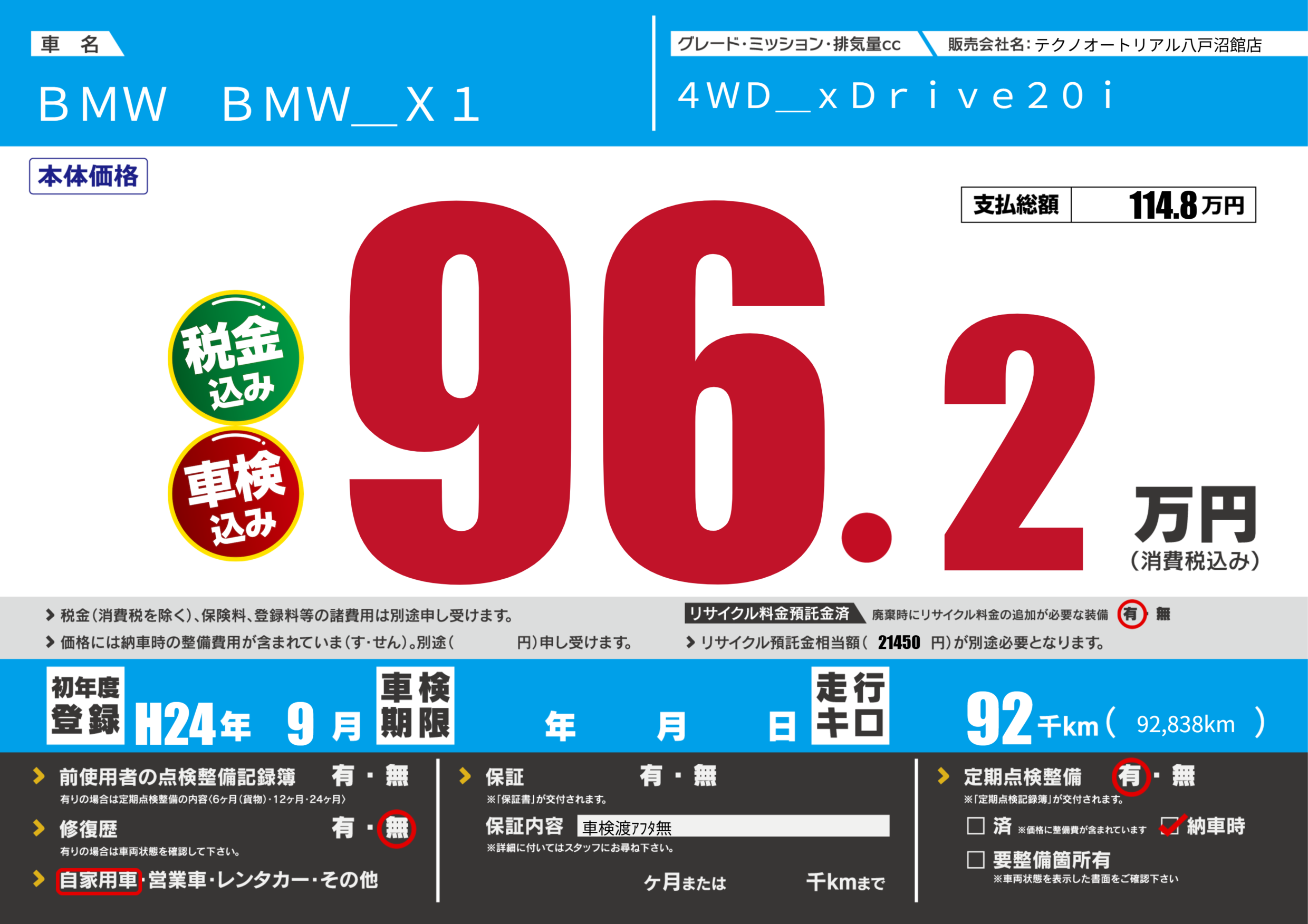 あり | リサイクル預託金相当額 | ( 21450円)が別途必要 |