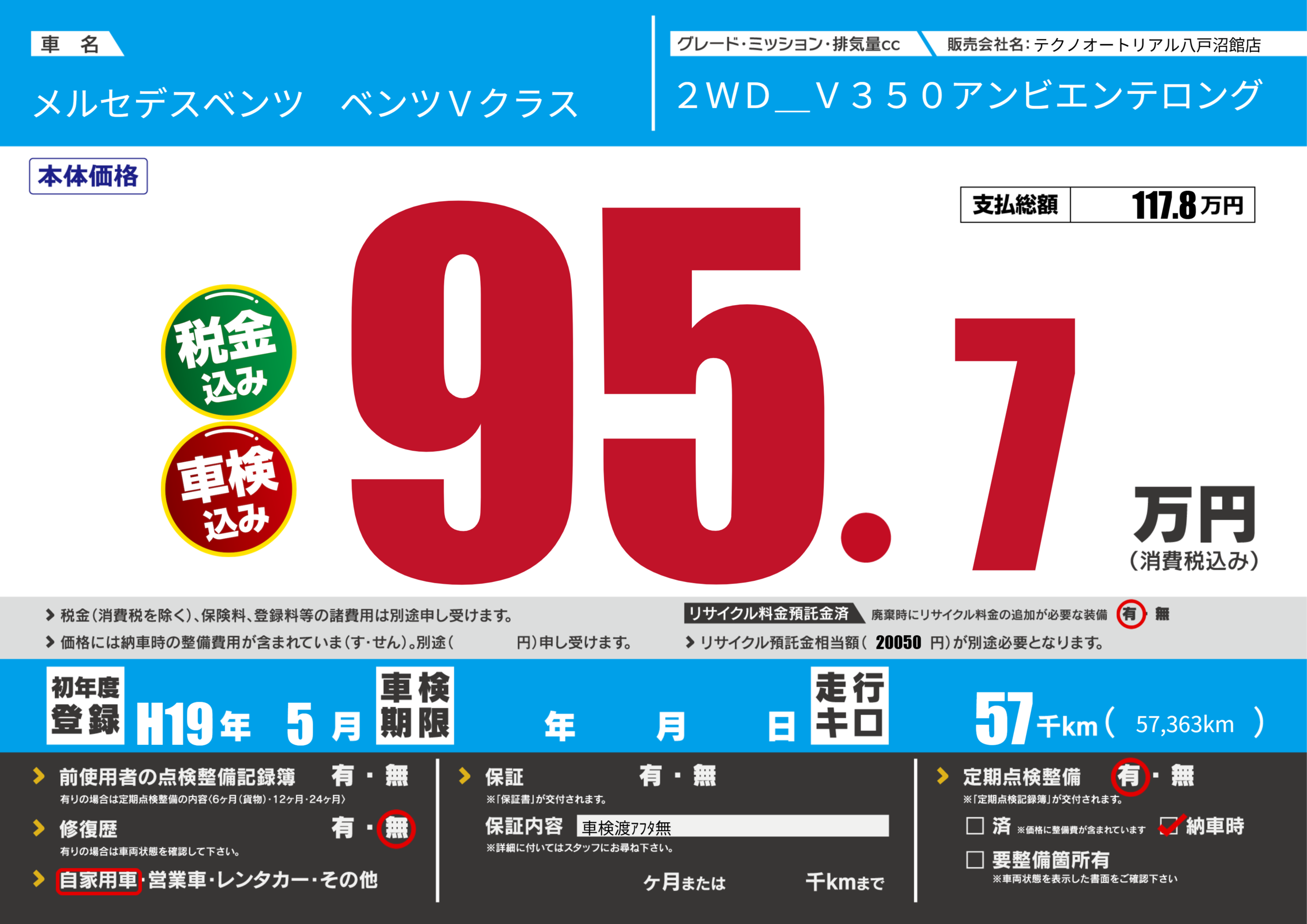 | 車名 | メルセデスベンツ ベンツVクラス | グレード ミッション 排気量 |