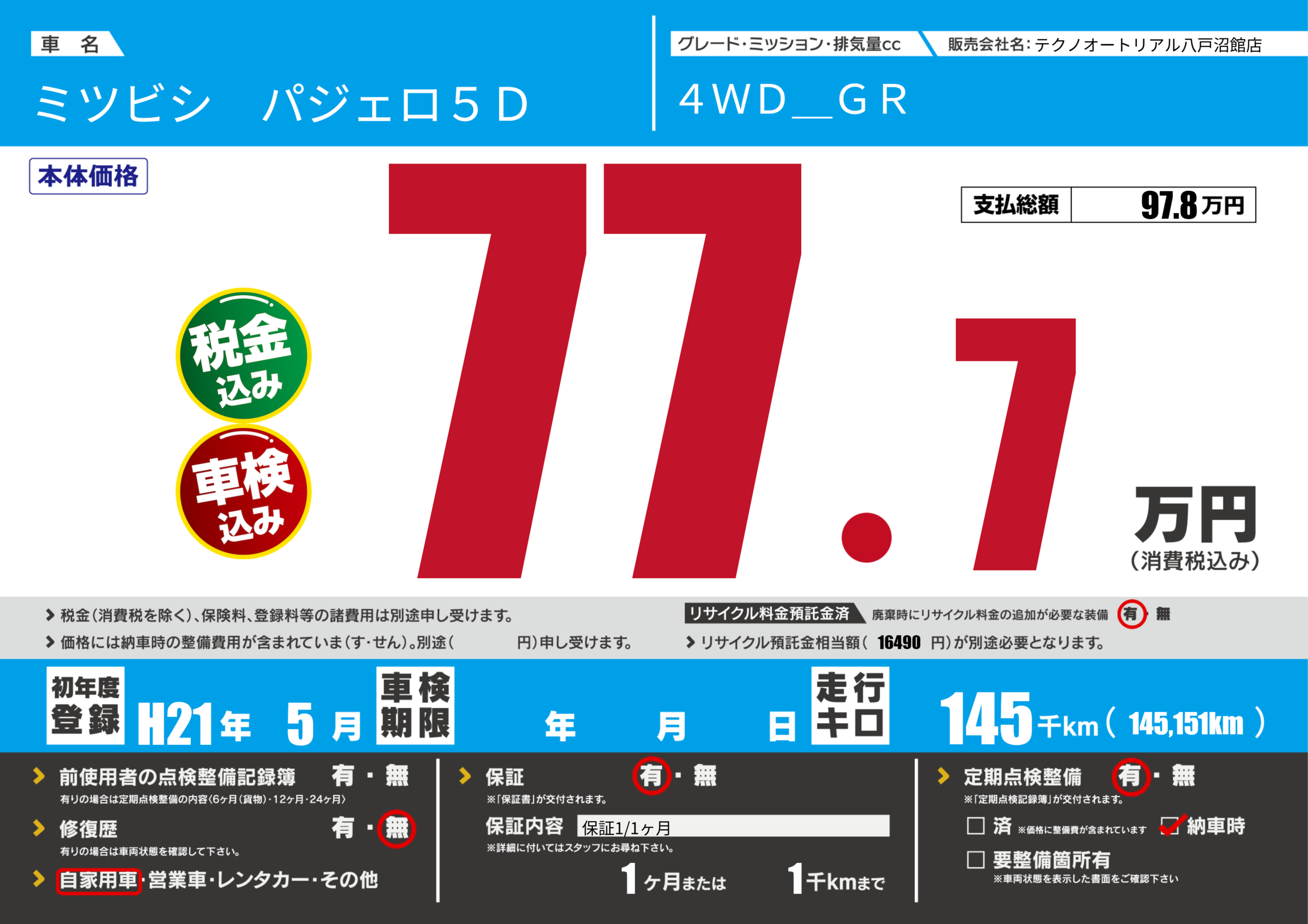 | 車名 | ミツビシ パジェロ5D | グレード ミッション 排気量 |