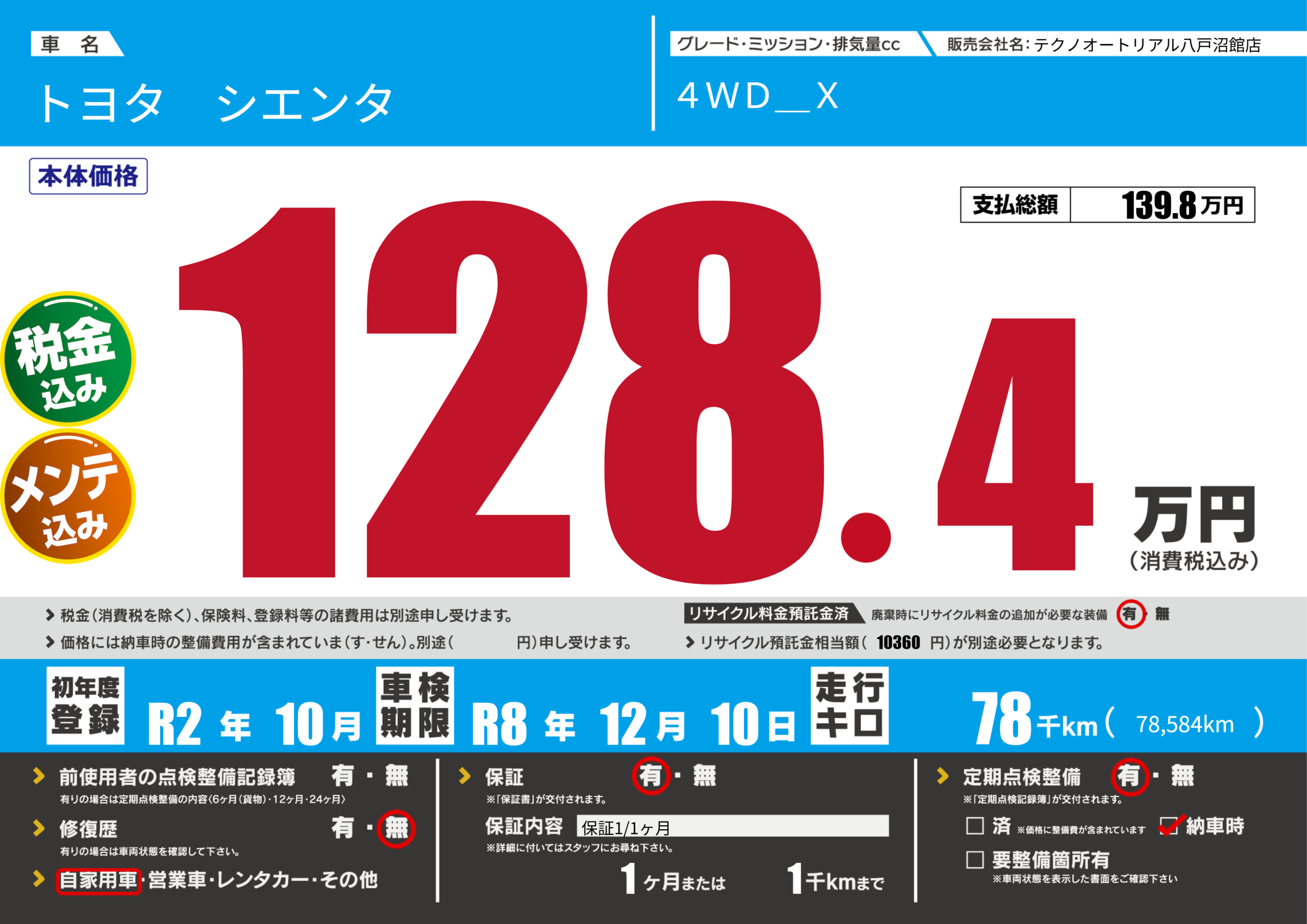 | 車名 | トヨタ シエンタ | グレード ミッション 排気量 |