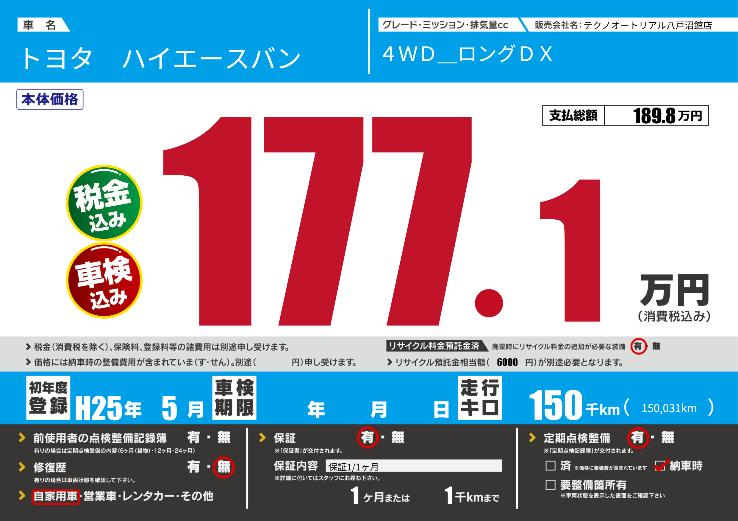 | 走行キロ | 15万km | 初年度登録 | H25年5月 |