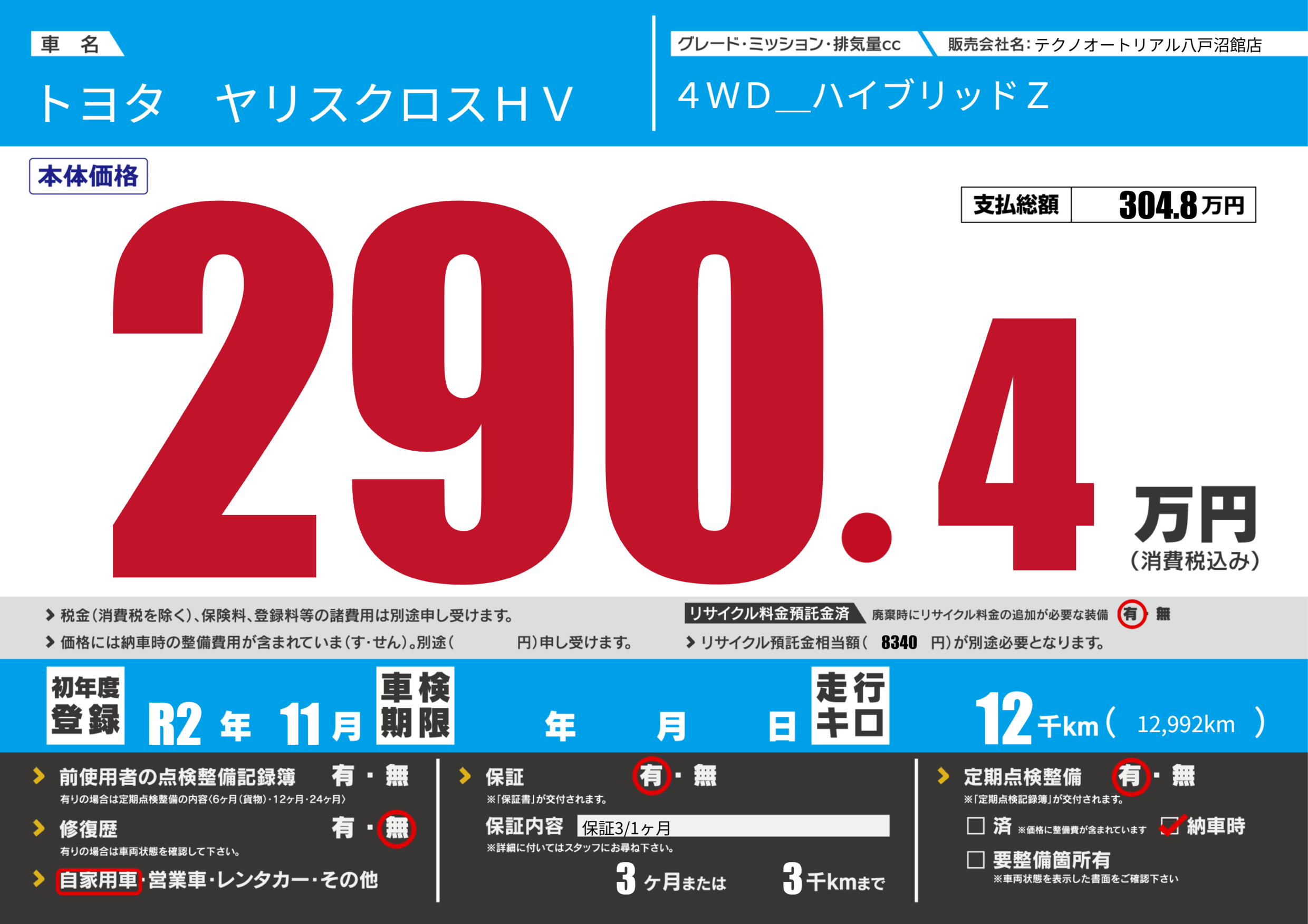 あり | リサイクル預託金相当額 | ( 8340円)が別途必要 |