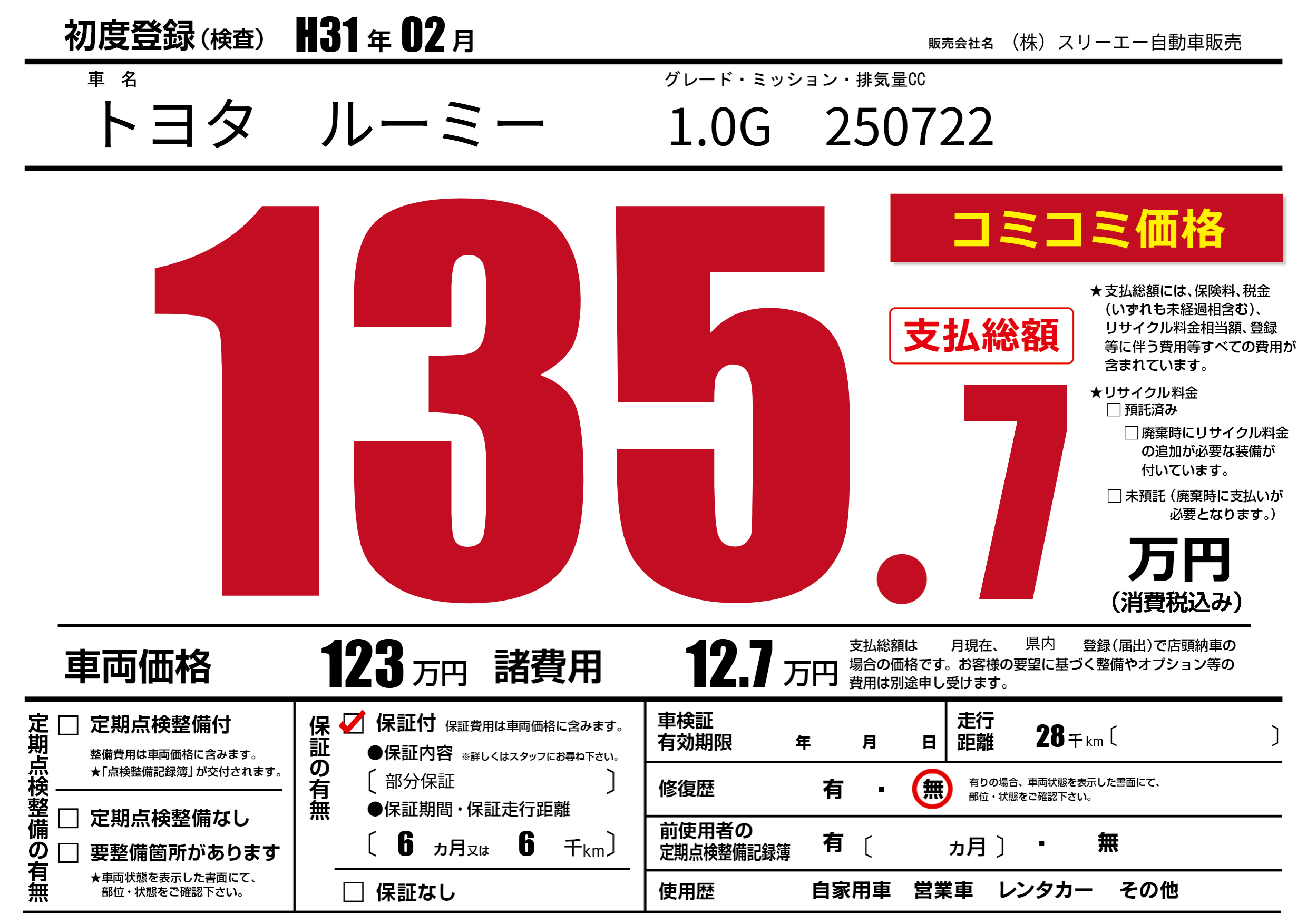| 車名 | トヨタ ルーミー | グレード ミッション 排気量 |