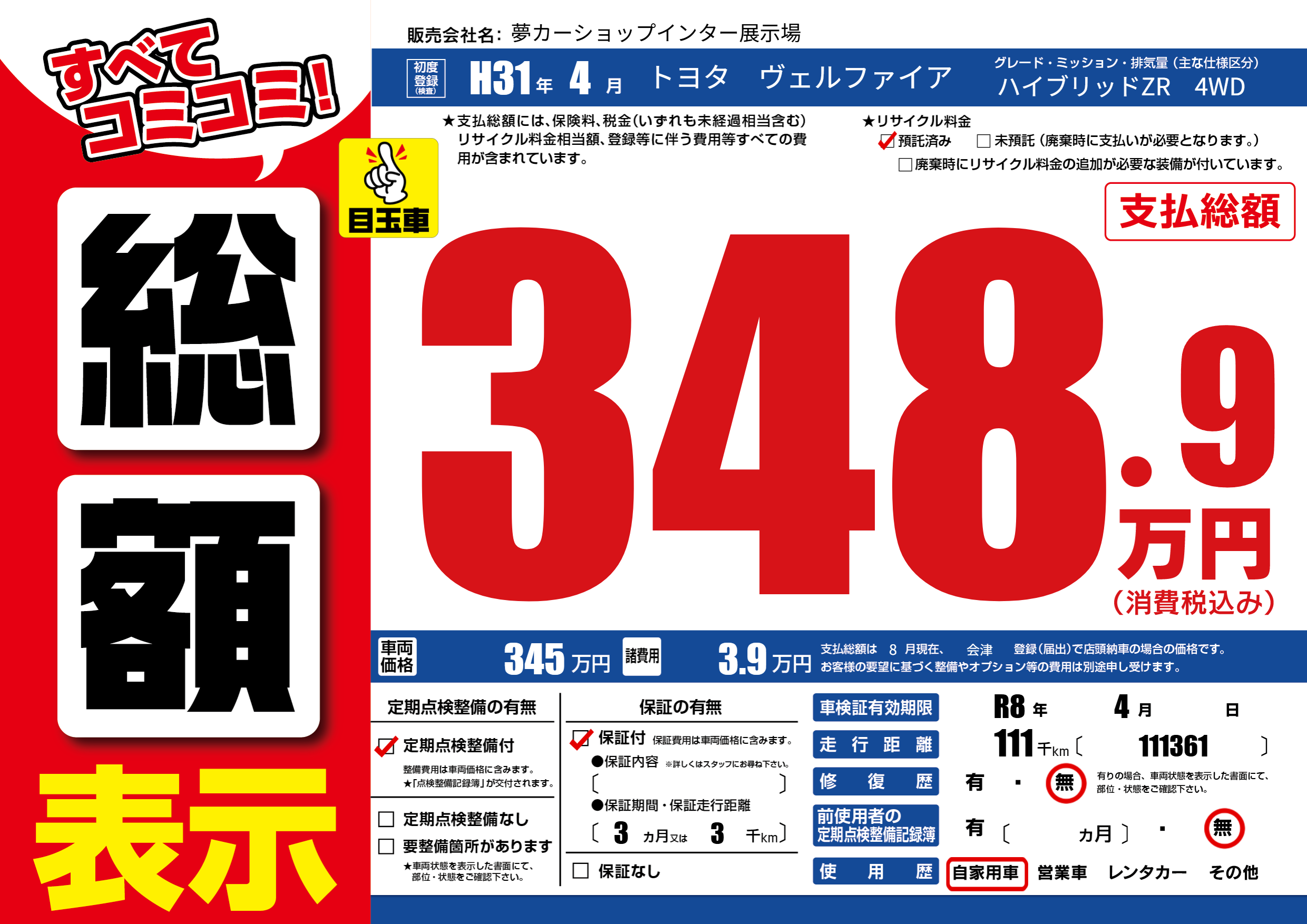 | 車検制限 | R8年 4月 - 日 | ||